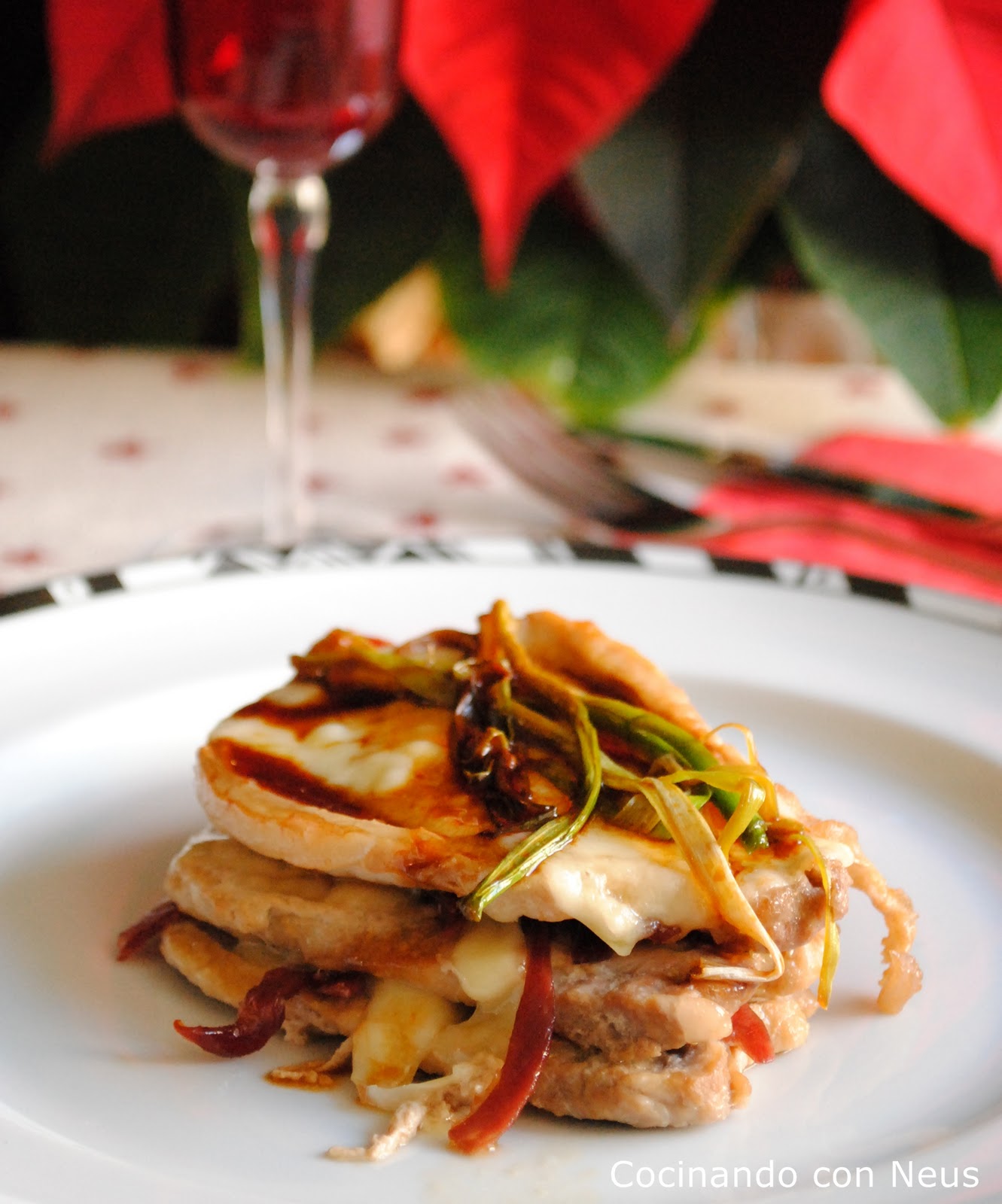 Capas de lomo con jamón ibérico, gruyère, mozzarella, coronado con unos ajos tiernos con salsa de soja.