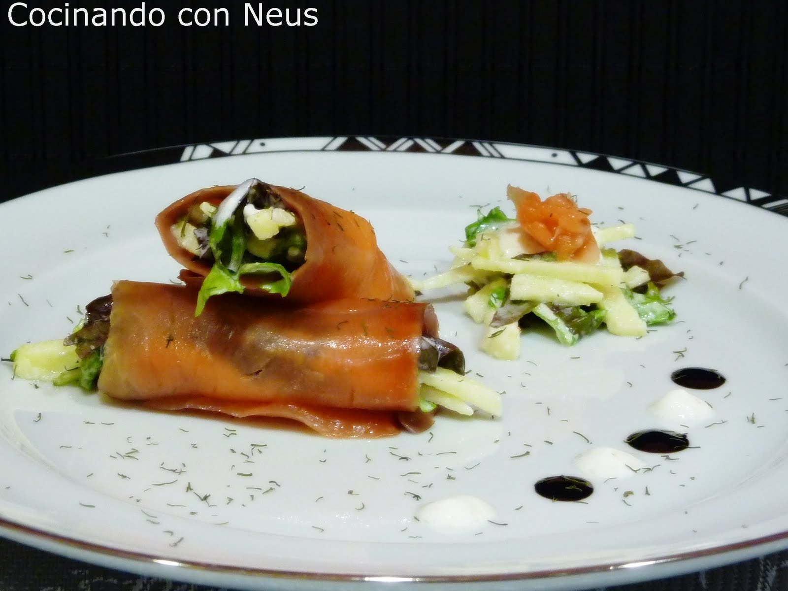M'encanta el salmó fumat i així presentat com uns canelons queda boníssim jo en faig uns farcits d'escalivada, però aquests amb poma i enciam deuen estar boníssims!!!