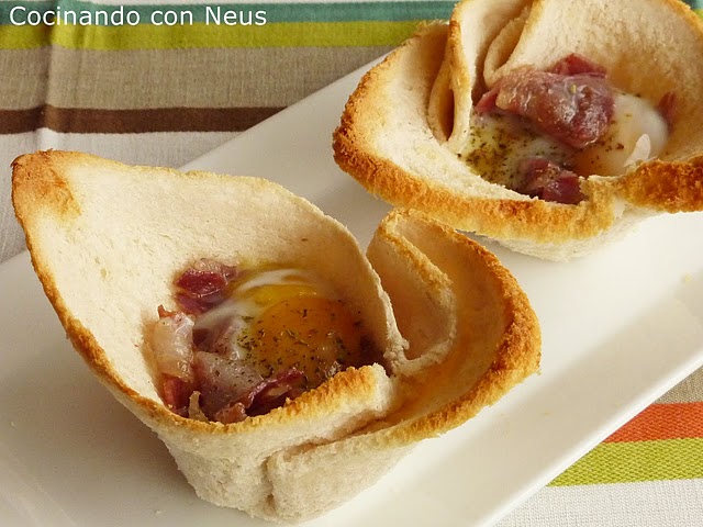 Con el pan forramos un molde de magdalena, ponemos las lonchas de jamón, yo cortadas en finas tiras, el huevo una pizca de sal y al horno durante unos minutos hasta que cuaje el huevo.