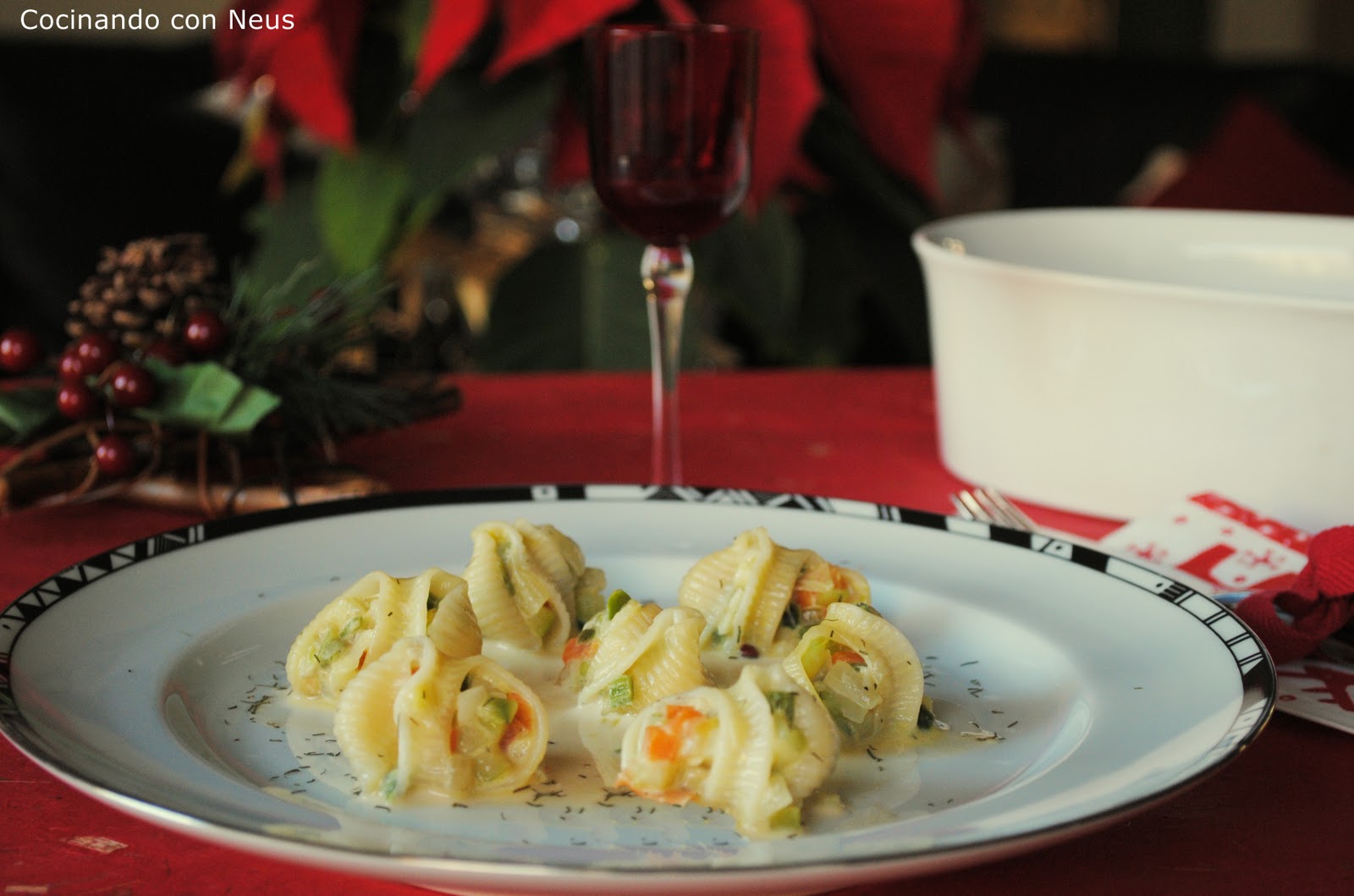 Neus, me encanta este plato, lo veo genial como plato principal y también se me ocurre poner estas conchitas rellenas de verduritas como acompañamiento, tiene un montón de posibilidades ¿verdad?