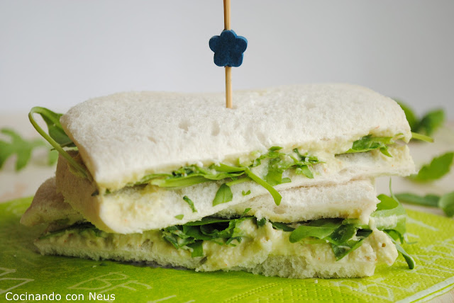 Untar el pan de molde con la mezcla, añadir unas hojas de rúcula y servir.