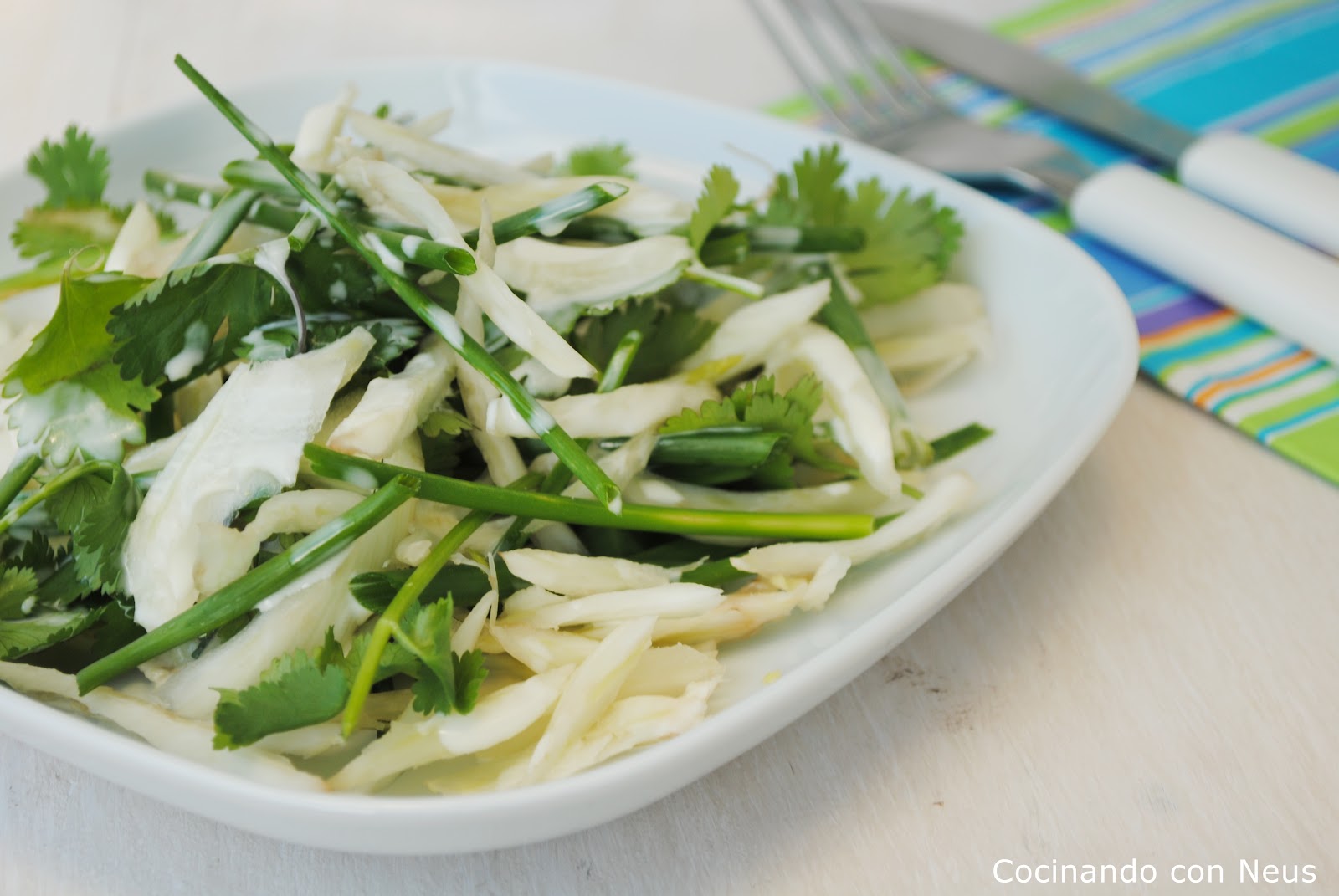 Esta receta la vi en Canal Cocina, en el programa de  Donna Hay. Me encanta verla cocinar, lo hace todo tan fácil que anima a probar a sus platos, como esta ensalada fresca y ligera, que combina cilantro, cebollino e hinojo.