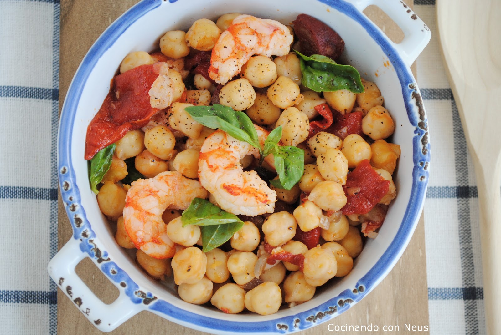 Mientras en otra sartén freímos las gambas con una cucharada de aceite de oliva. Una vez hechos los añadimos al guiso de garbanzos, salpimentamos, espolvoreamos con albahaca y servimos.