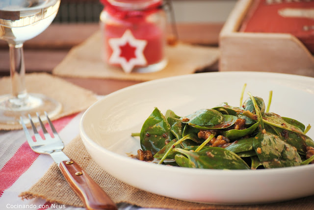 Bueno pues os traigo una ensalada de espinacas con un aliño templado de nueces y mostaza a la antigua.