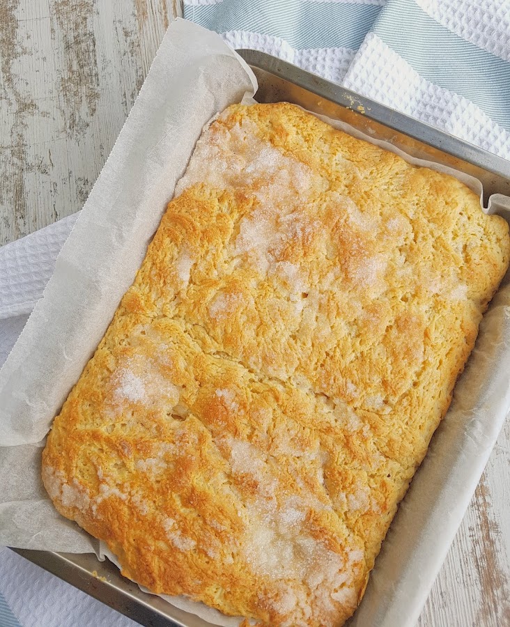 Nota: Yo he utilizado una bandeja de 25 cm x 25 cm, de esta forma queda más alta pero vosotros podéis poner el molde que queráis, solo variara el grosor de la masa, si ponéis la masa en un molde más largo quedará más delgado el pan pero con una costra más grande de azúcar en la superficie.