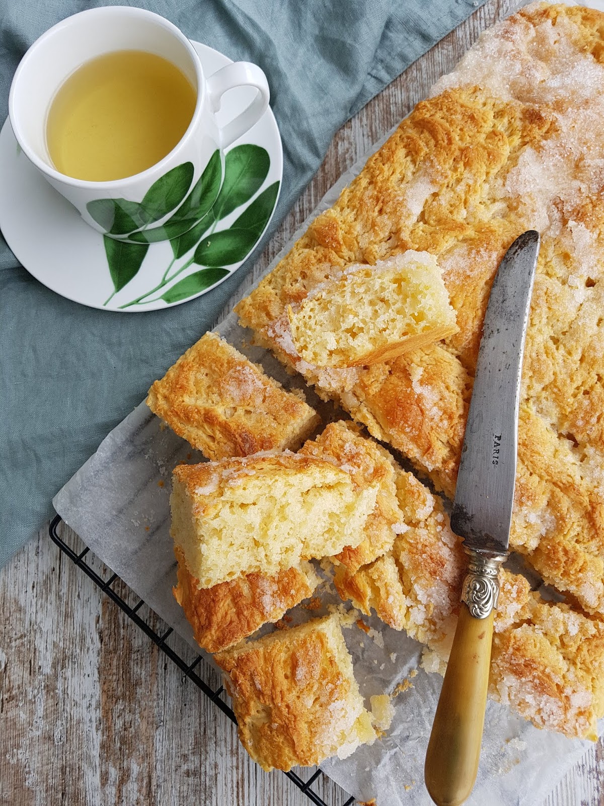 Retiramos la masa del vaso volcándola en una bandeja forrada con papel de hornear, la aplastamos ligeramente con las manos, espolvoreamos el azúcar y rociamos agua con la ayuda de un vaporizador.