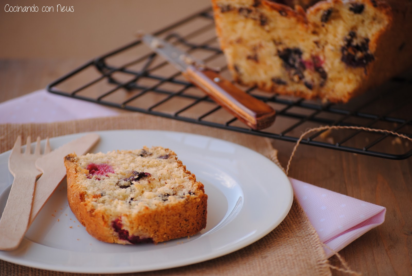 Me encanta las masas que llevan frutas, le dan jugosidad y mucho sabor. Este cake es compacto pero cada bocado que das es delicioso por la combinación de frutos rojos y las gotas de chocolate que lleva.
