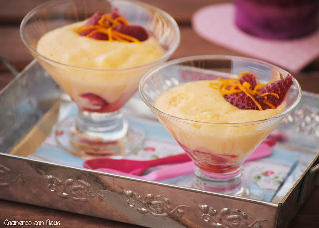 Poner fresas en el fondo de la copa, verter la crema. Dejar enfriar y antes de servir decorar con unas laminas de fresa y unas tiras de naranja.
