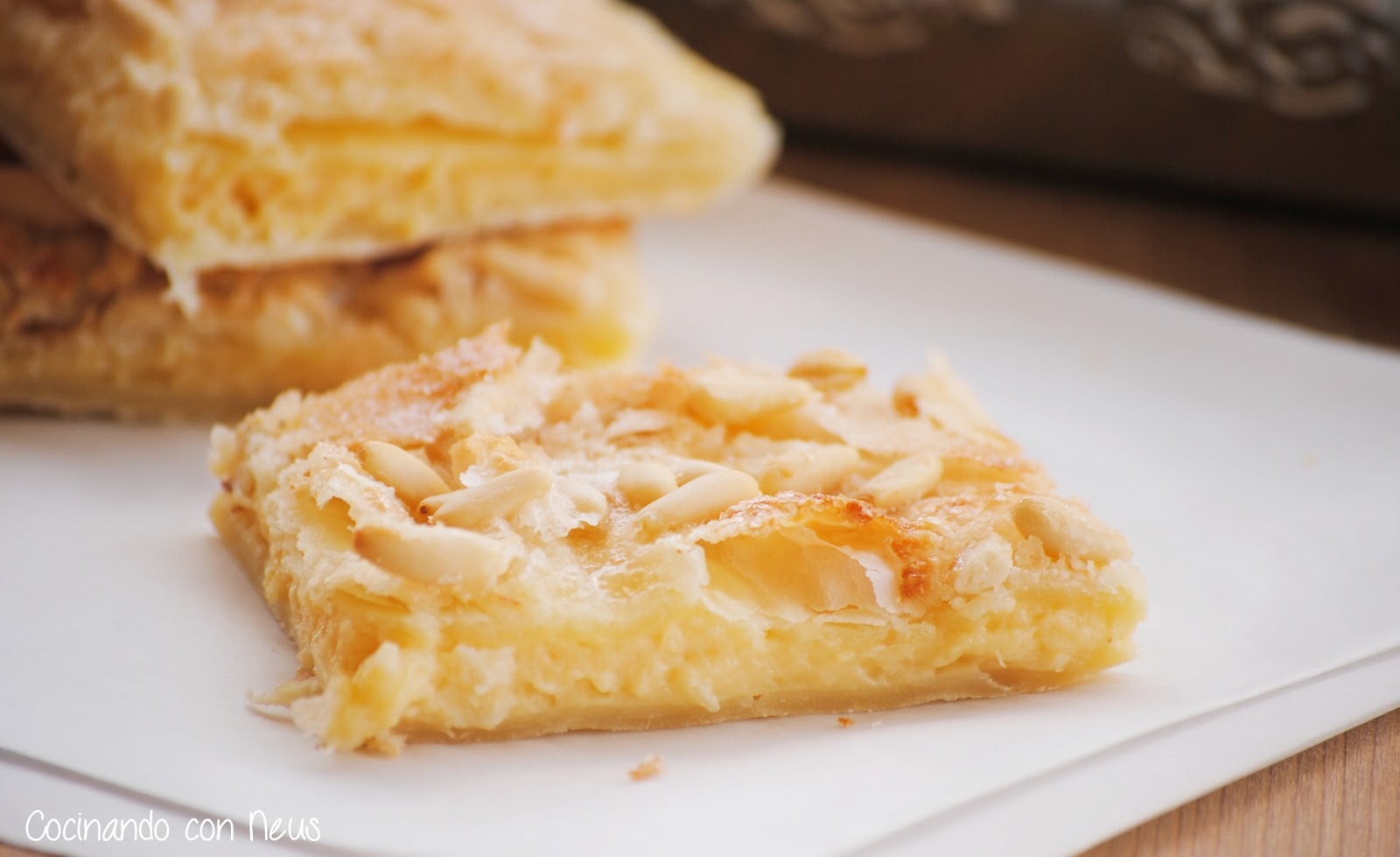 Extendemos una de las láminas de hojaldre sobre el papel de hornear, cubrimos con la crema pastelera sin llegar a los extremos.