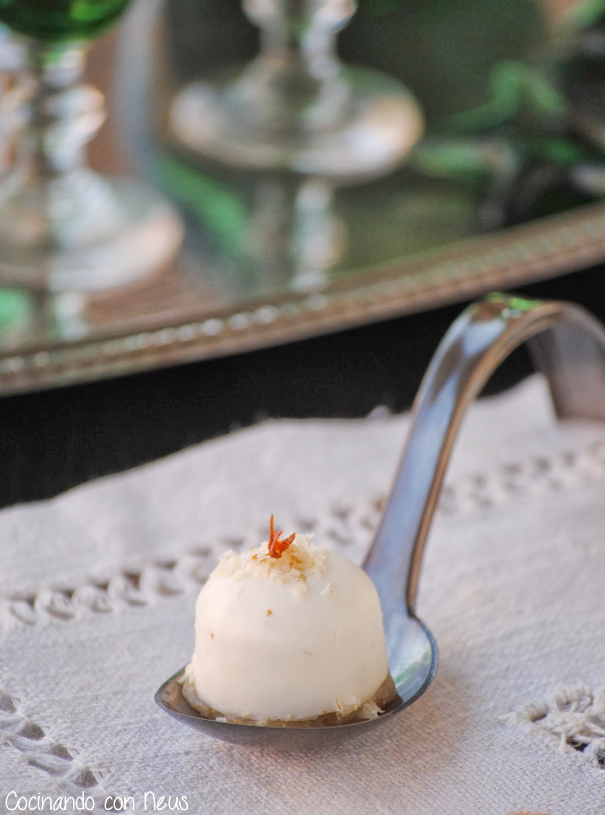 Ponemos un circulo de pera en la cucharilla donde vayamos a servir el bombón, colocamos una semiesfera de pannacotta y dejamos a temperatura ambiente en 10 0 15 minutos ya estarán a la temperatura para consumirlos (yo los he tenido hasta 20 minutos y estaban perfectos).