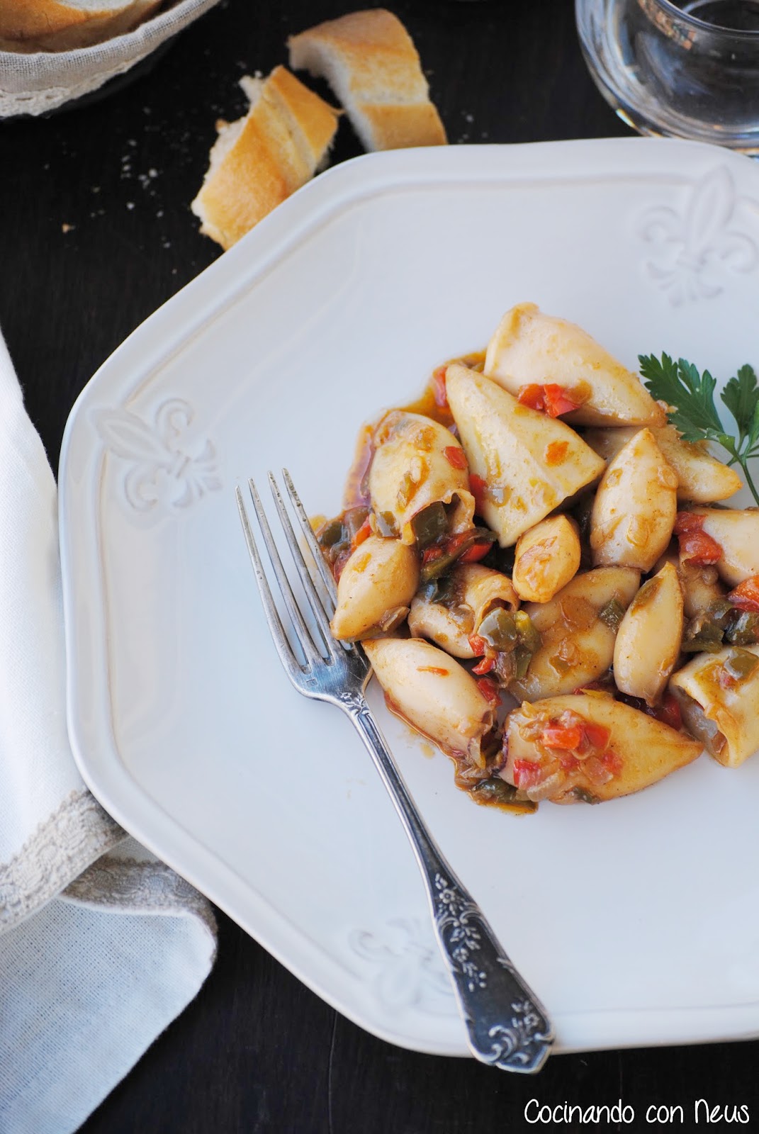 Siempre he comido este plato con los calamares troceados, pero así la presentación queda más bonita.