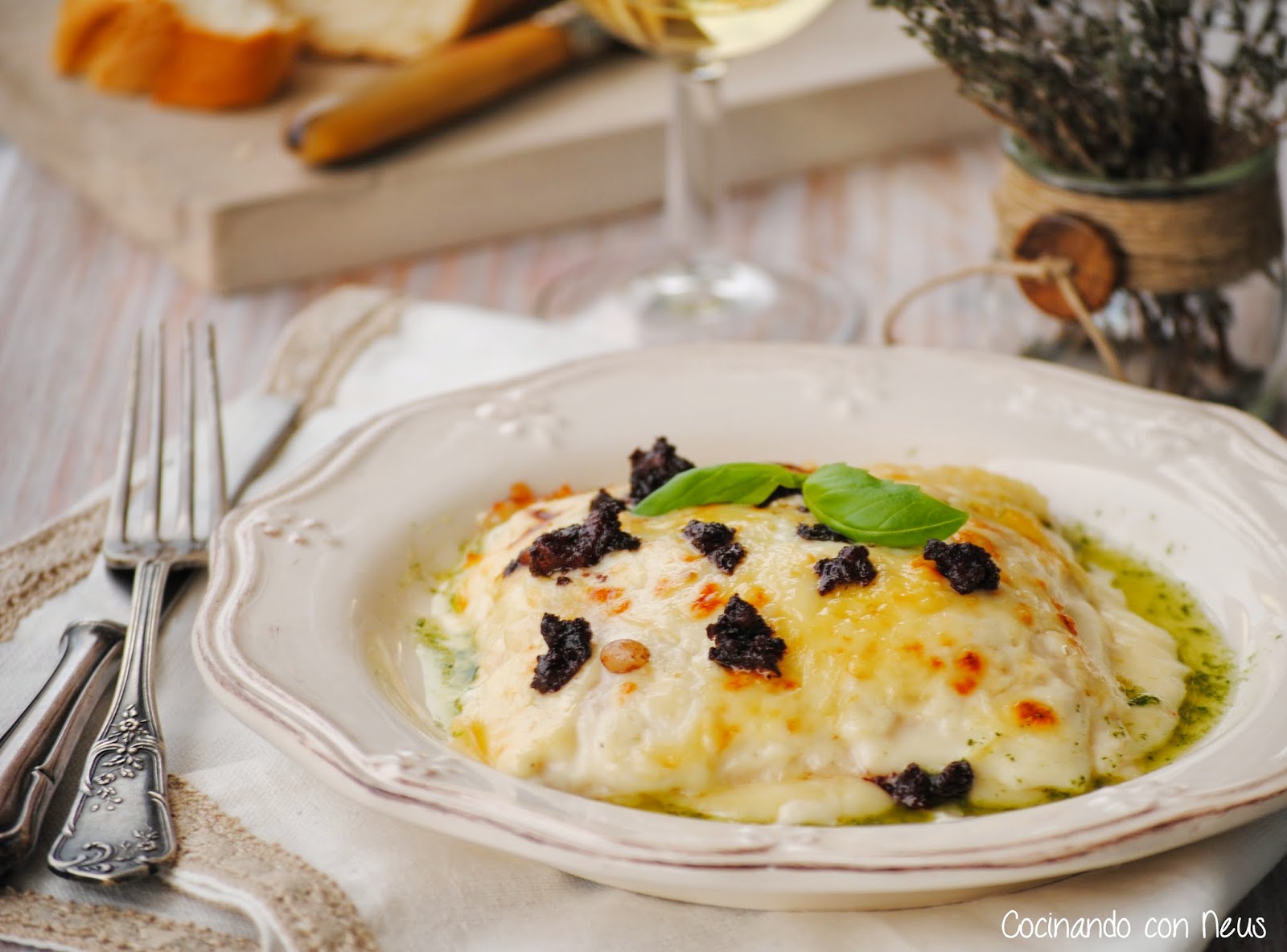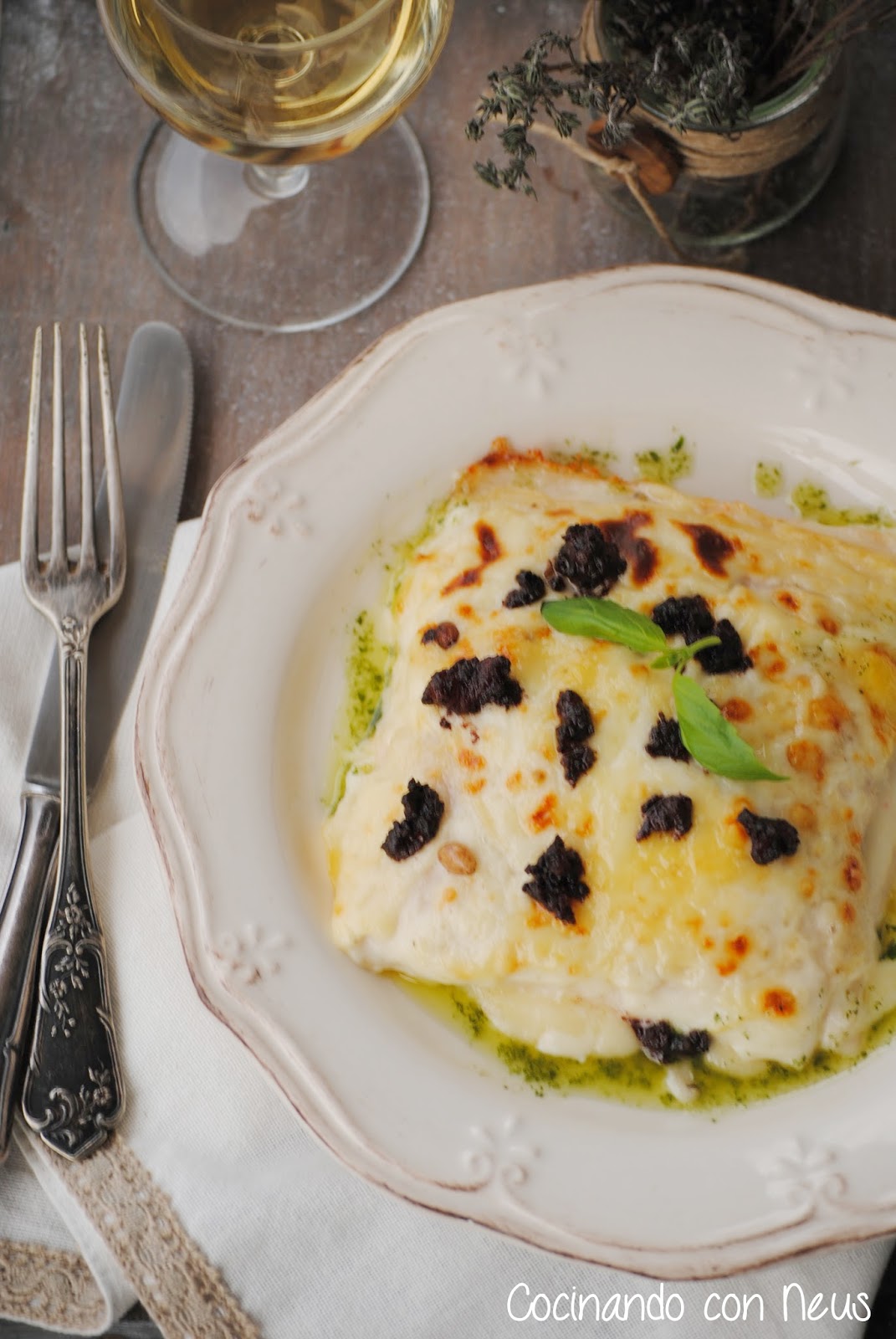 Servir la lasaña y rociamos con un hilo de aceite de albahaca y rallamos Pecatum por encima (en su defecto puede ser butifarra negra o morcilla).