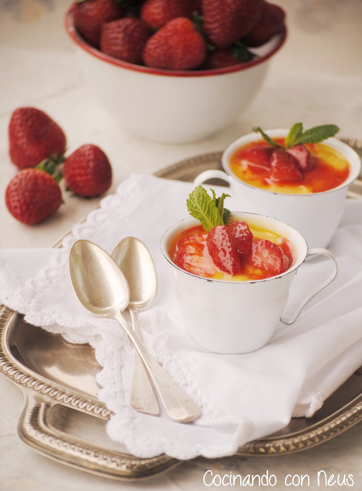 En el blog ya tengo publicada la crema catalana, pero esta vez he cambiado el limón por naranja y he añadido unas fresas salteadas.