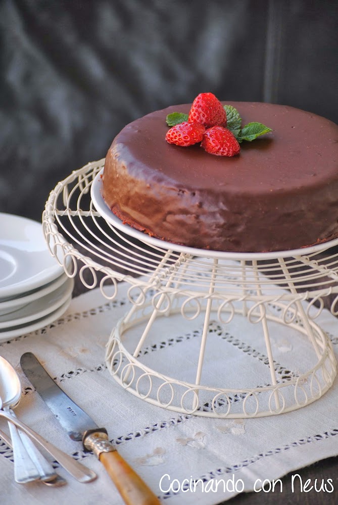 Cuando el bizcocho este totalmente frío, verteremos la cobertura caliente tirando al hilo desde el centro y dejando caer el chocolate por los lados, dejar enfriar completamente para que el chocolate se endurezca. Podemos guardarla en el frigorífico.