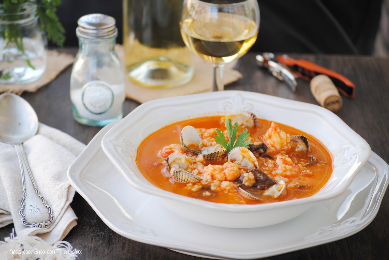 Esta vez vuelvo a cocinar con Thermomix, el resultado de los arroces secos, no me gusta mucho, pero los caldosos es otro cantar. Cuando empecé a cocinar no me atrevía con los arroces en la cazuela y de los primeros que hice fue con Thermomix y caldosos, me lance al de bogavante, no está publicado, por qué aún no tenía blog y en casa se comía sin foto, ahora evidentemente todo pasa por el escenario, es maquillado y fotografiado jajaja