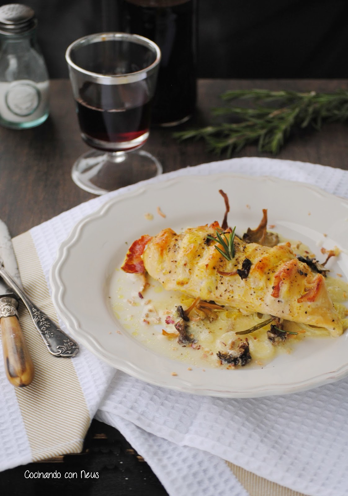 Cuando vi esta receta en el blog de Dolores, sabía que en casa les gustaría mucho a mis hijos, es muy similar al pollo relleno de queso cheddar envuelto con beicon, pero este va acompañado de una salsita muy sabrosa.