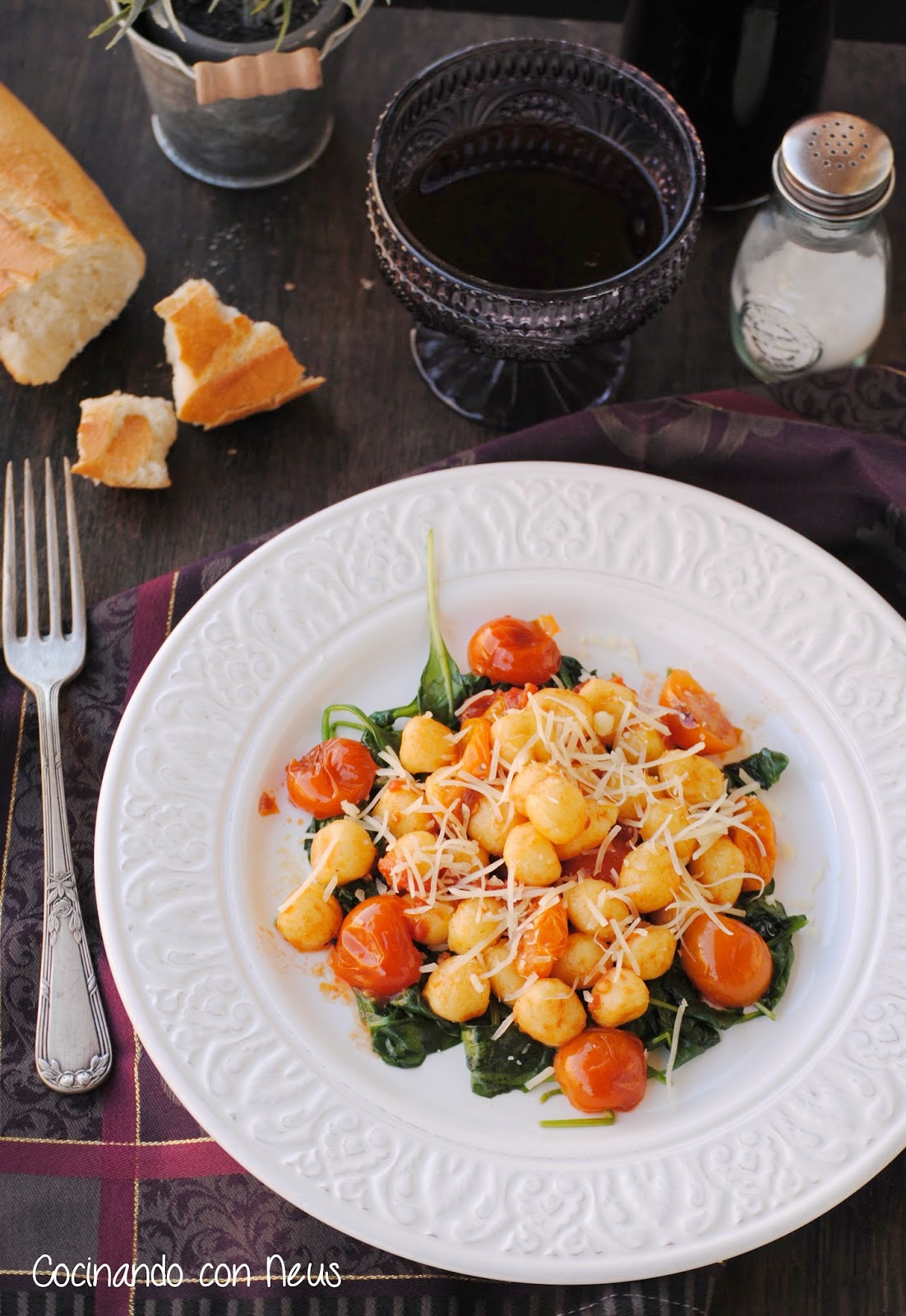 Ponemos en el fondo del plato unas hojas de espinacas, repartimos los gnochis y tomates cherrys, espolvoreamos con queso y servimos.