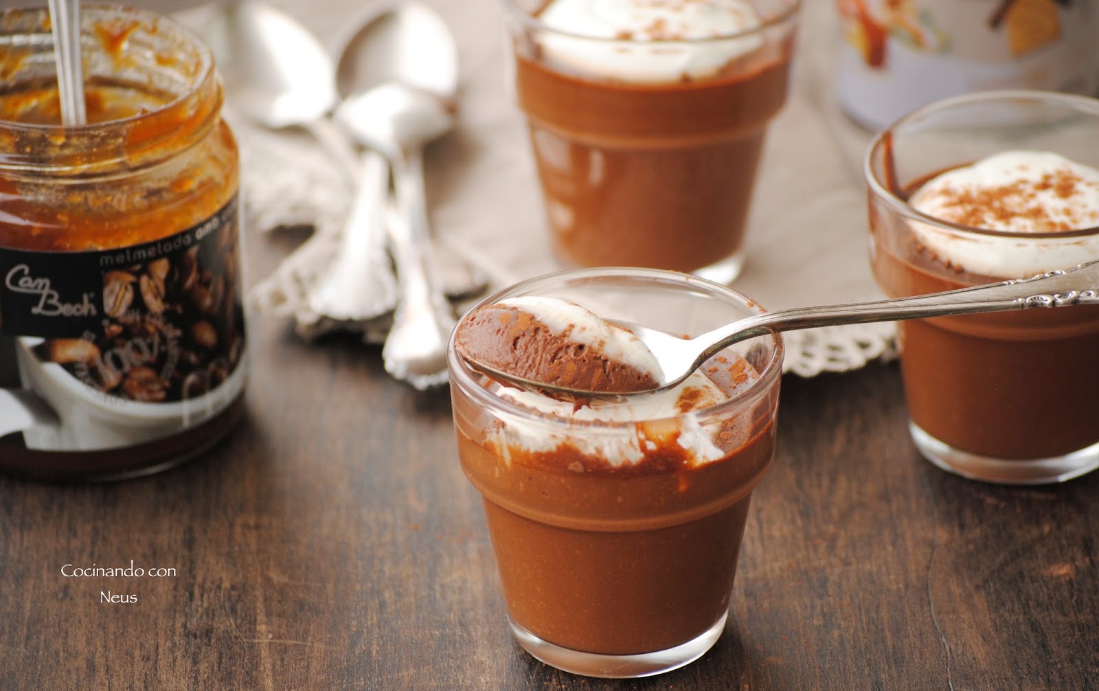 Añadimos (opcionalmente) la mermelada de café, mezclamos con las varillas y repartimos la mezcla en los vasitos que vayamos a utilizar.