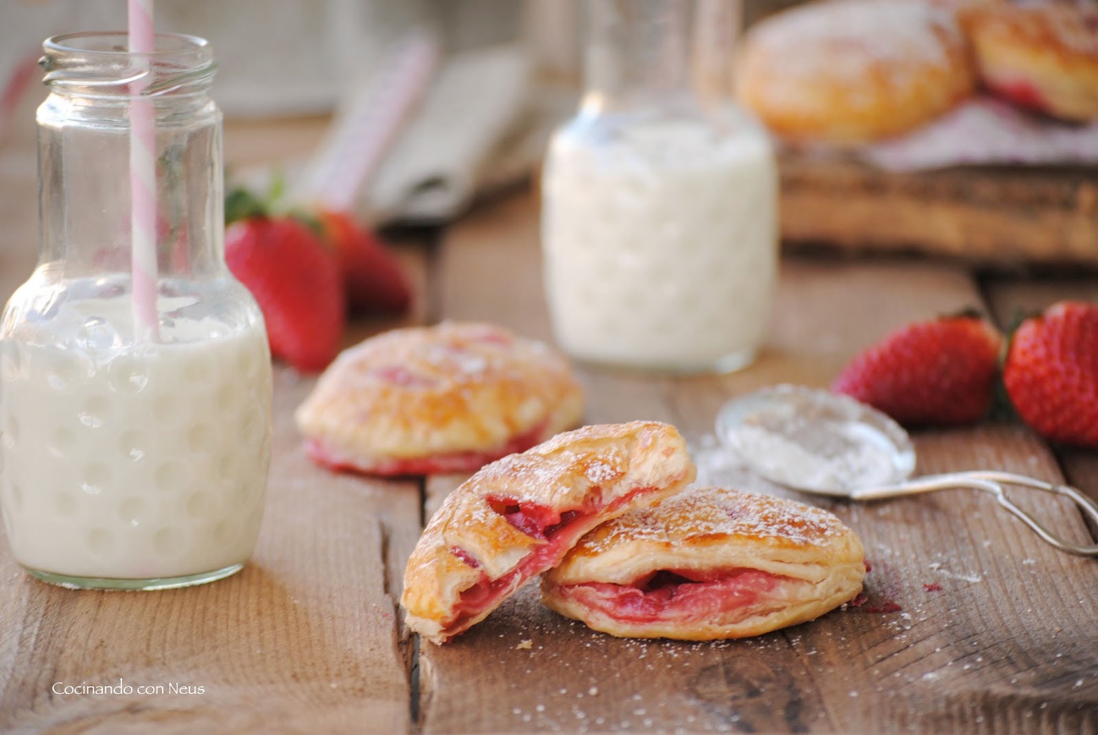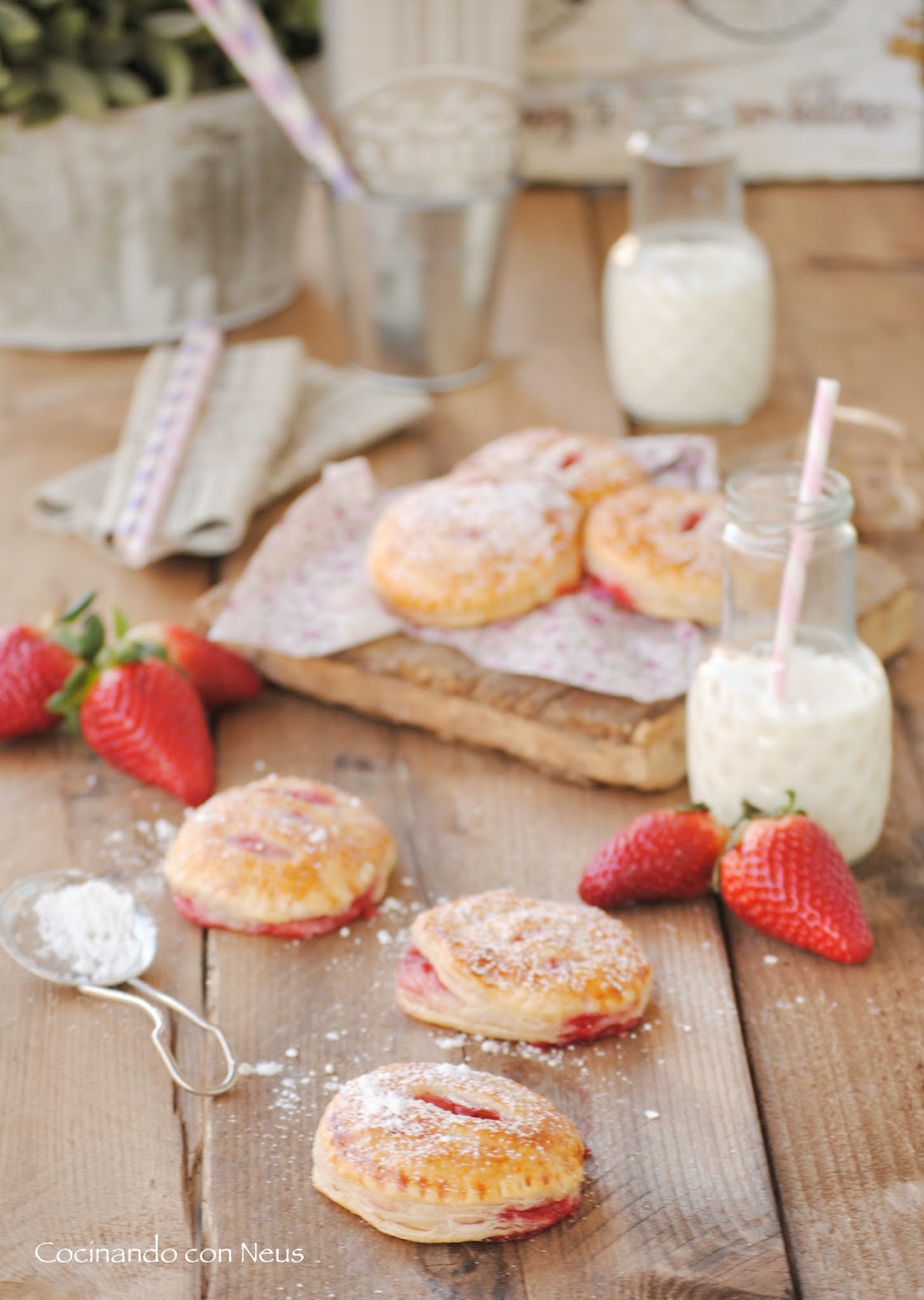 Ponemos las fresas en el centro y cubrimos con los círculos sin pinchar, cerramos bien los laterales con la ayuda de un tenedor para que no se escape el relleno. Hacemos unos pequeños cortes en la superficie para que se vaya el vapor del interior durante la cocción y así evitaremos que se hinche el hojaldre.