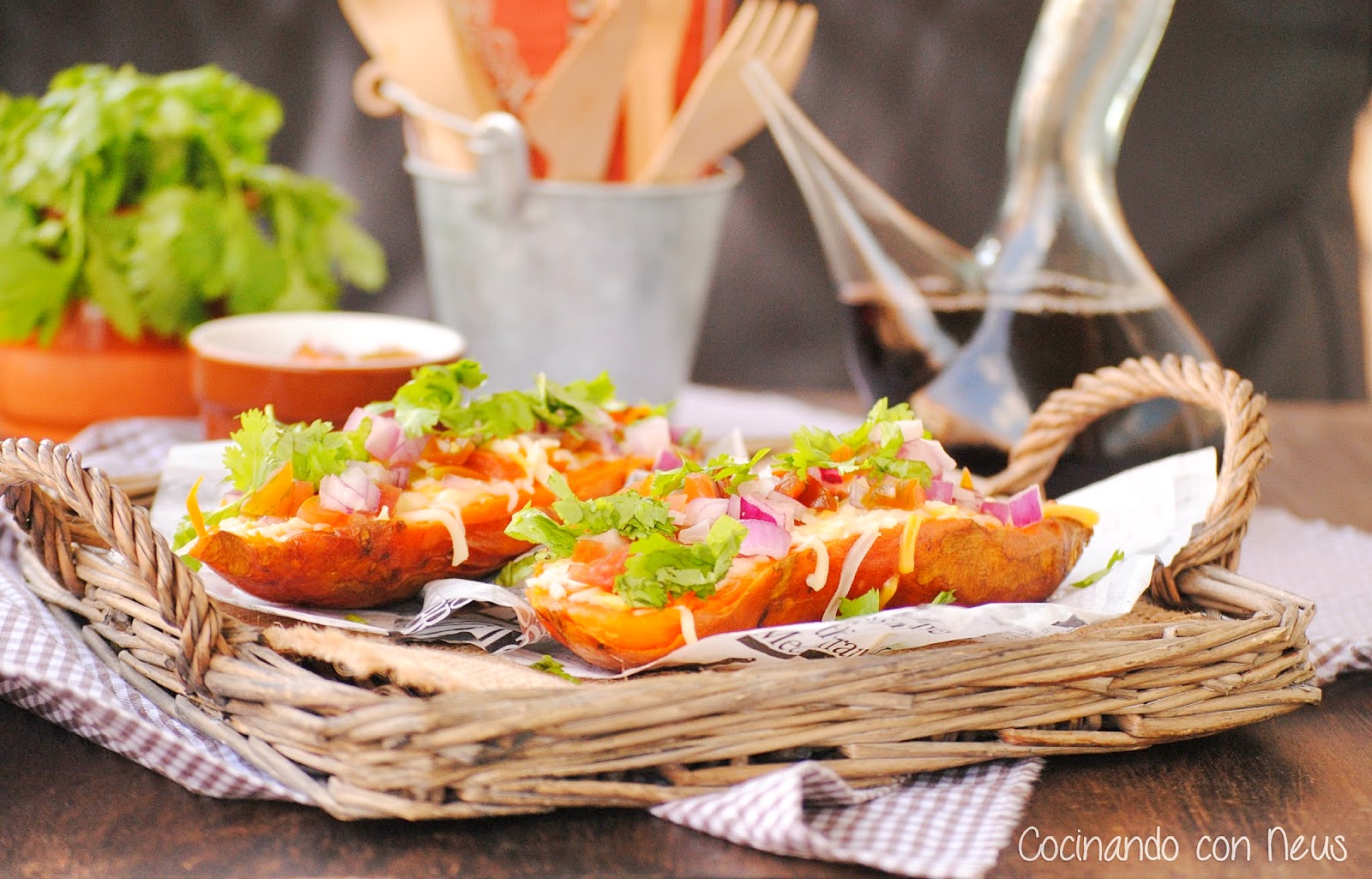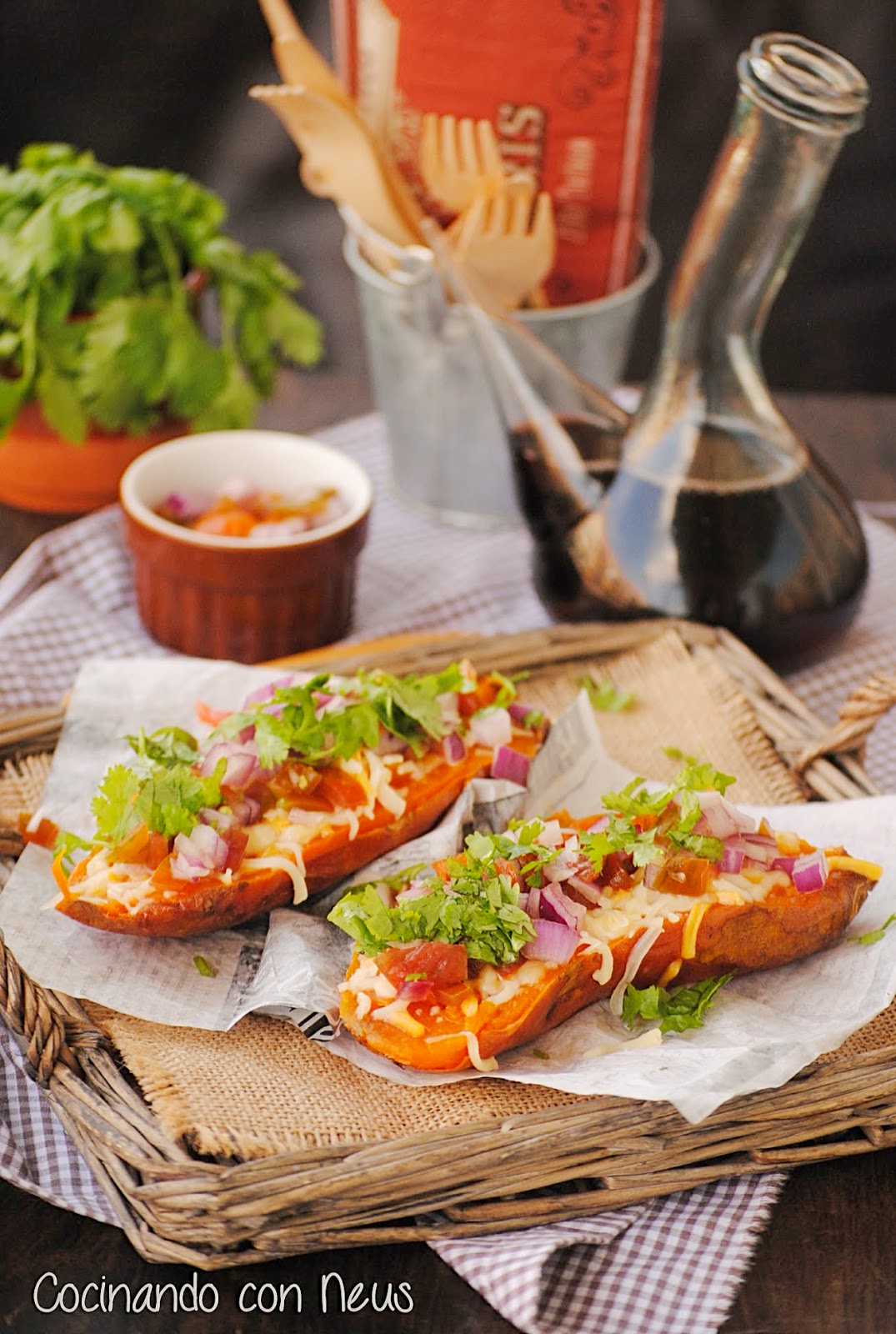Abrimos los boniatos por la mitad, troceamos un poco la pulpa, repartimos el queso rallado por la superficie, el mismo calor residual nos fundirá ligeramente el queso, cubrimos con la mezcla de tomate y cebolla, espolvoreamos con el cilantro y servimos.