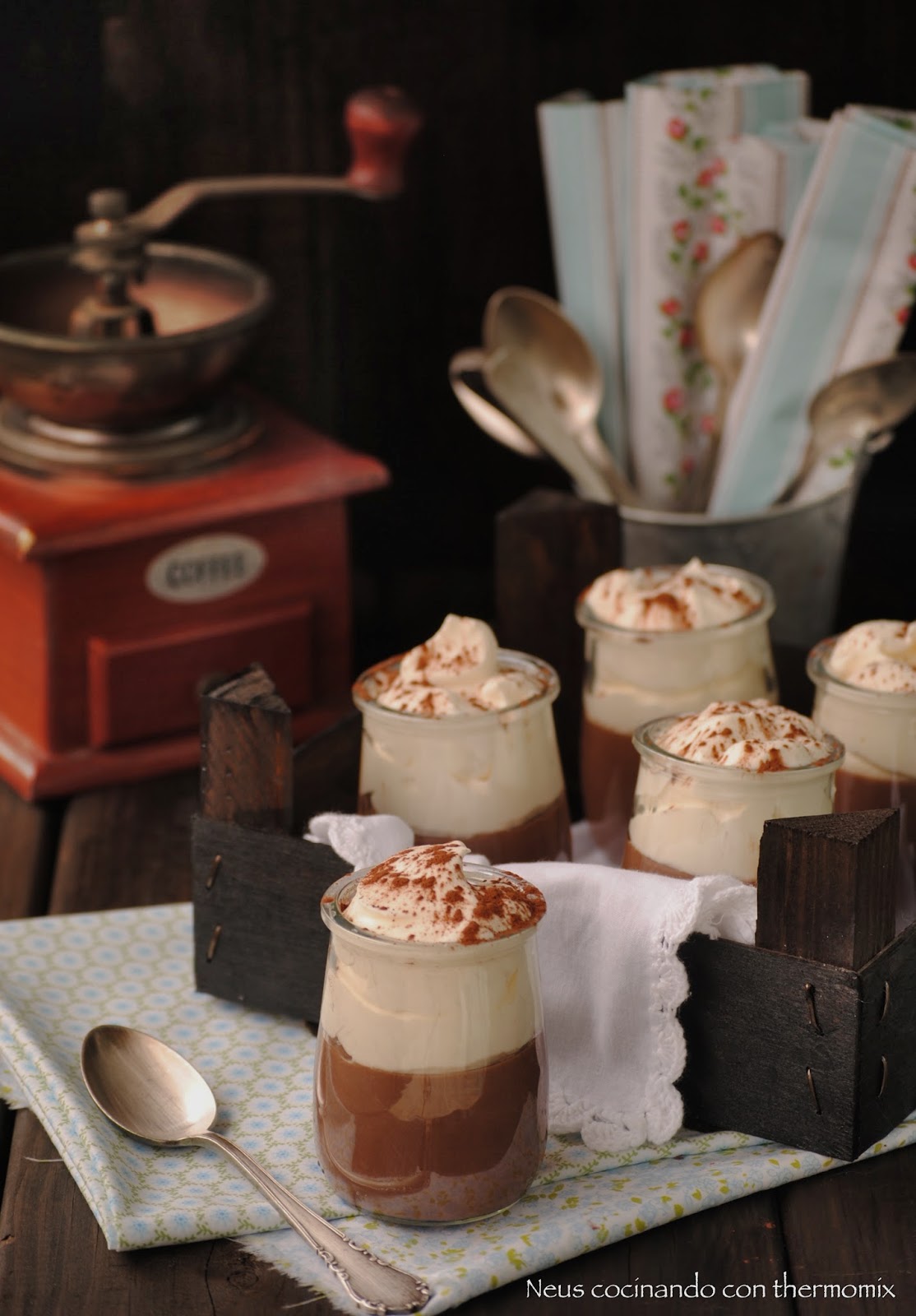 Antes de servir montamos la nata, repartimos entre los vasitos, y espolvoreamos cacao en polvo.