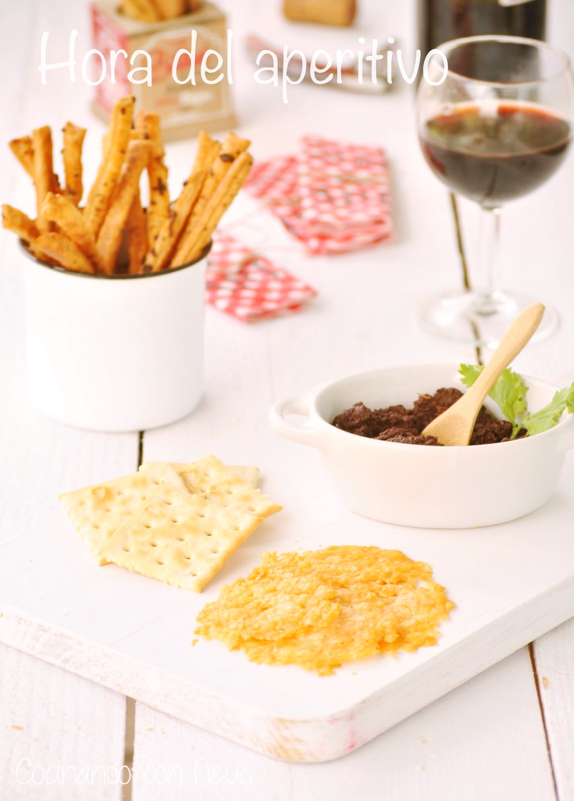 Olivada con bastones de hojaldre de cebolla y galletitas de parmesano