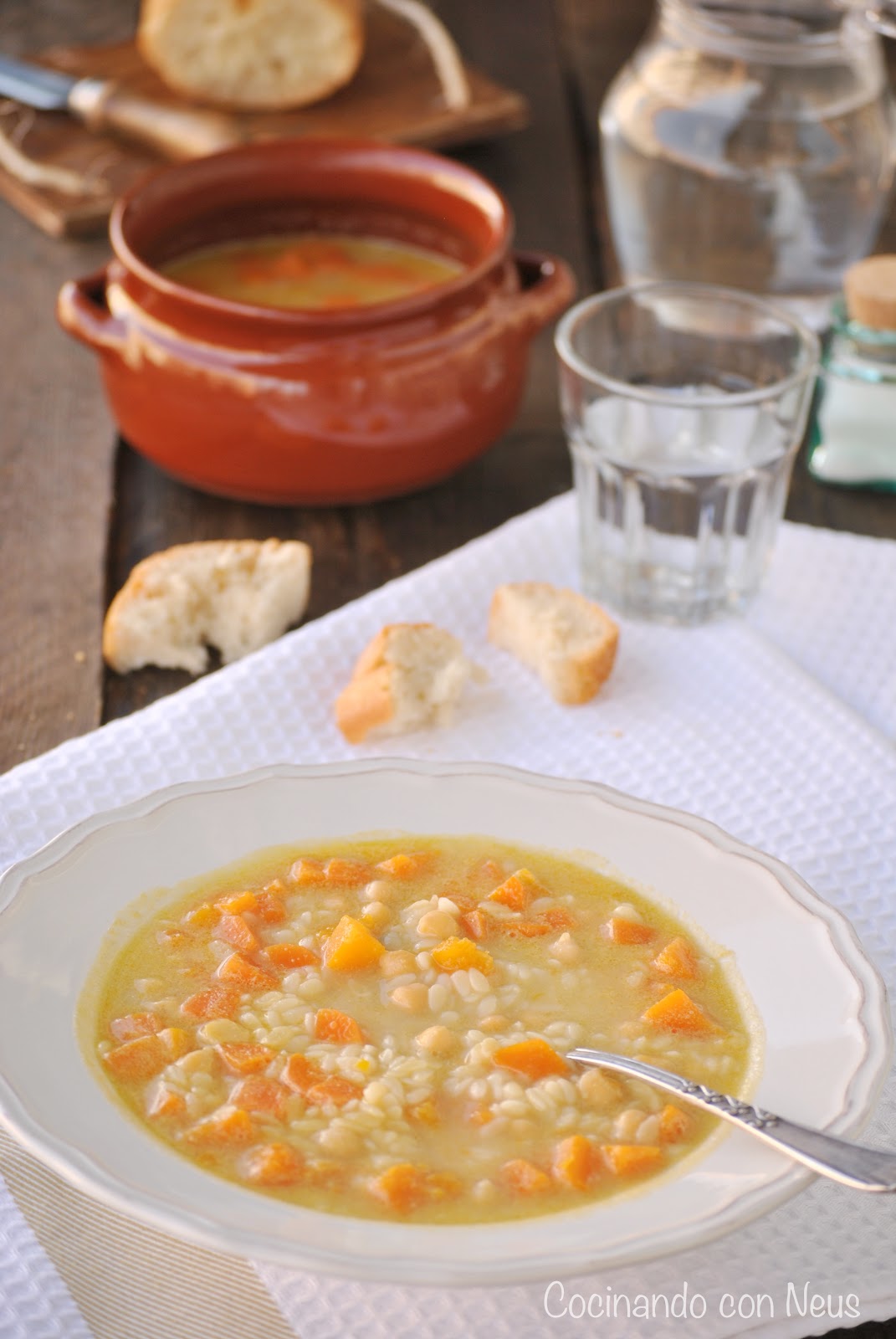 Sopa de piñones con verduras y garbanzos