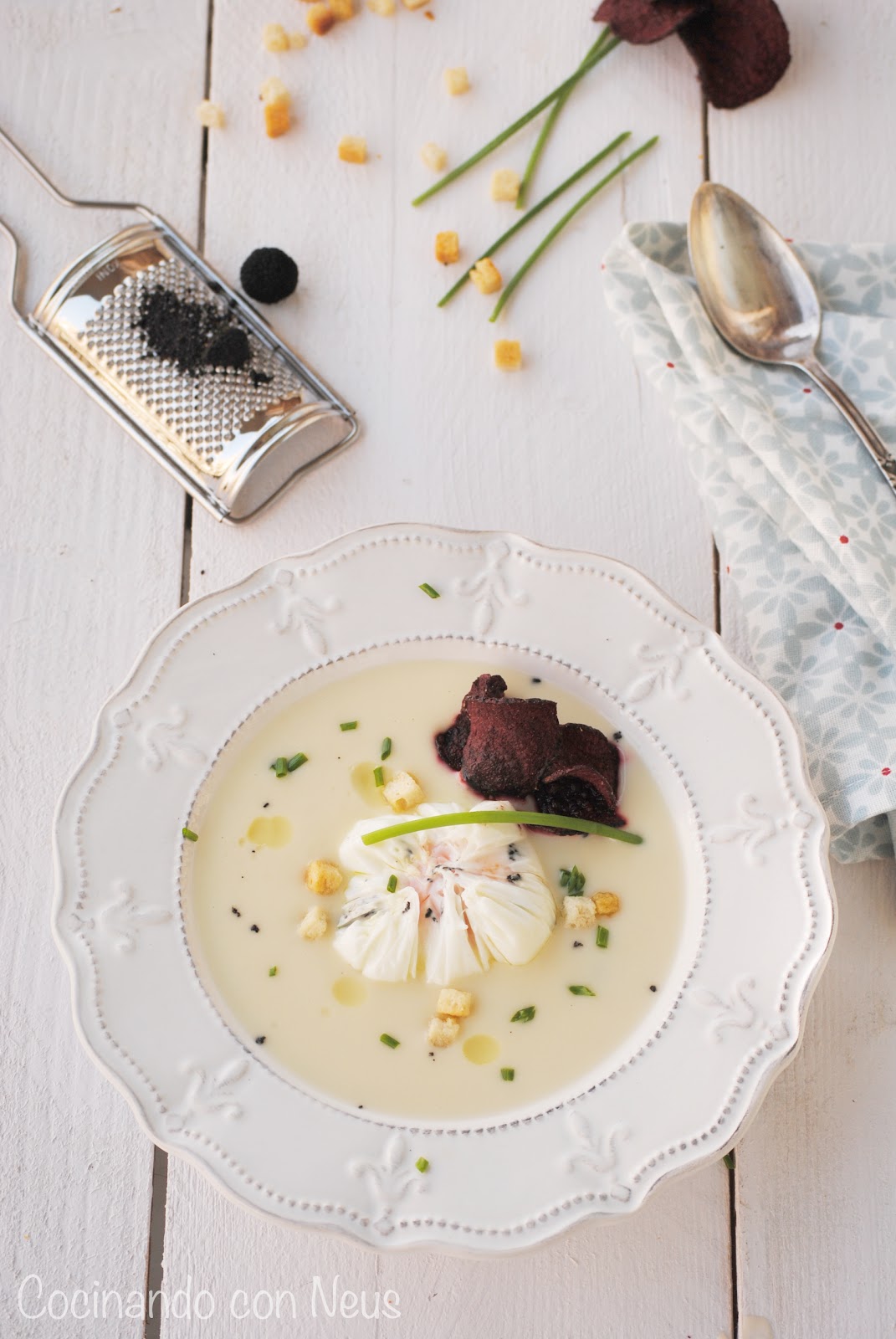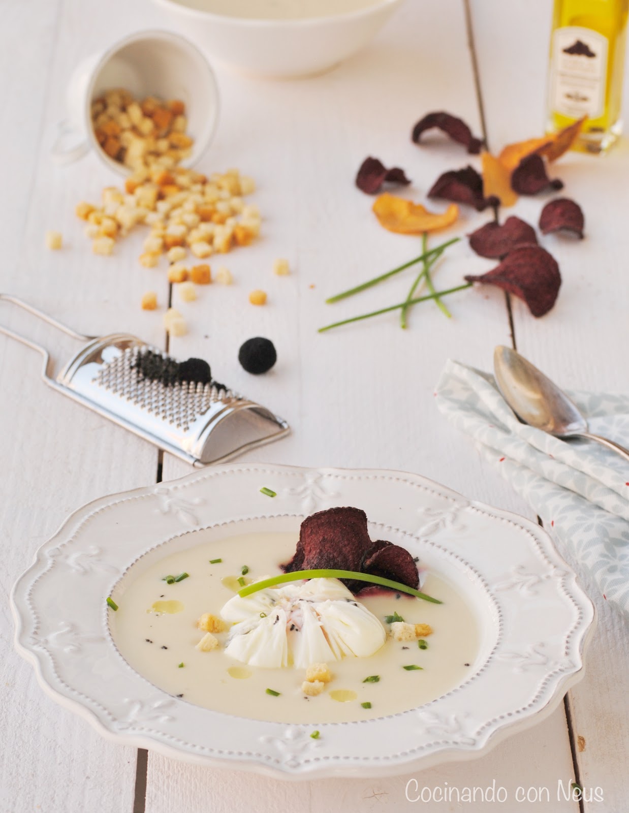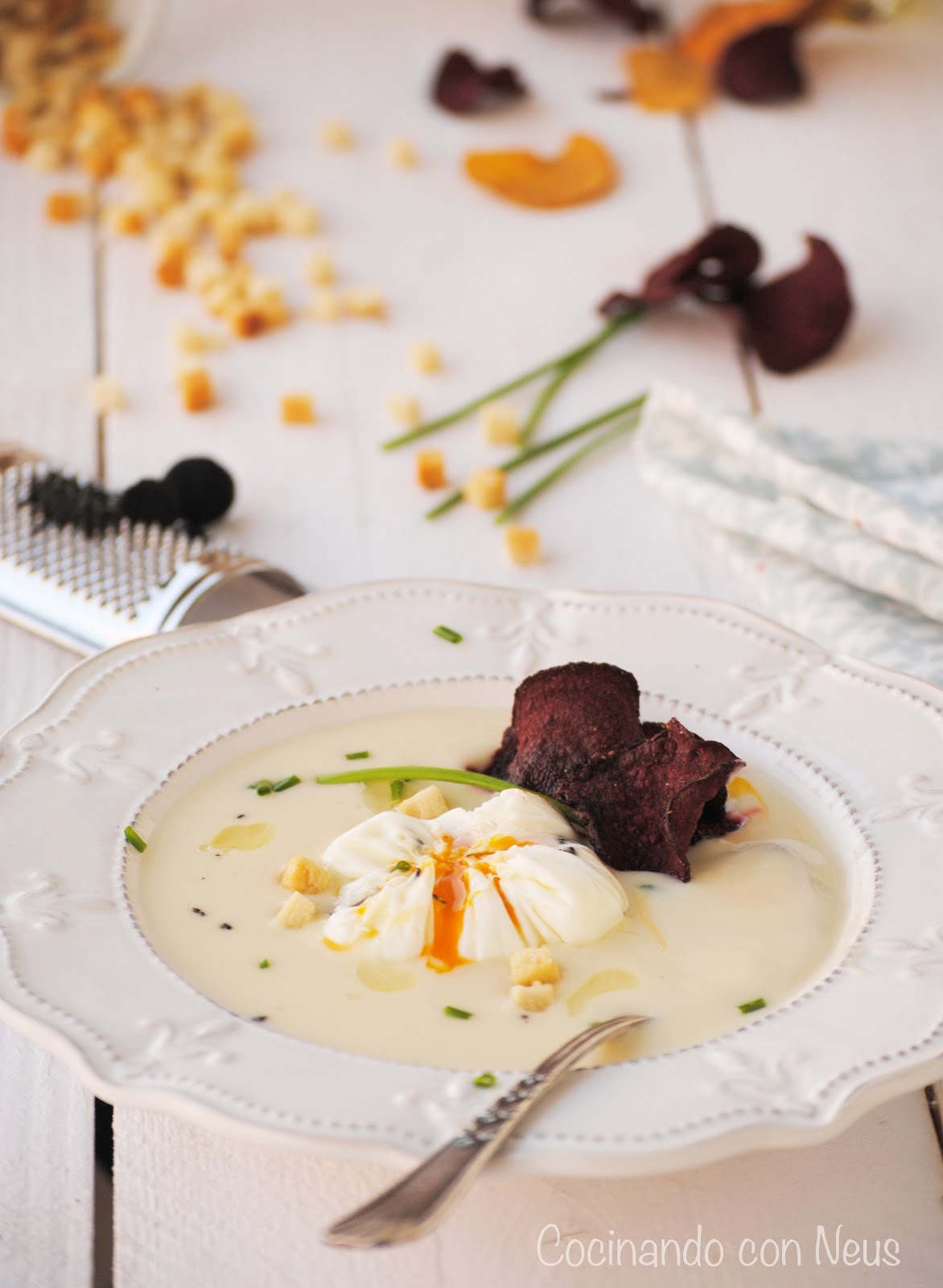 Servimos la crema, espolvoreamos con cebollino cortado, ponemos el huevo en el centro, rallamos un poco de trufa y decoramos con un hilo de aceite de trufa y unas chips de verduras (opcional).