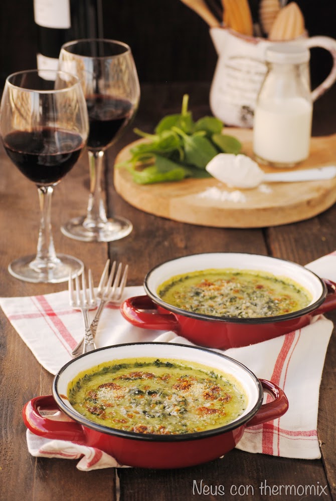 Nota: las espinacas frescas no van a caber bien el vaso, podemos saltearlas unos minutos previamente en una sartén para que pierdan el volumen, o añadirlas en dos tandas en el vaso, programamos el tiempo y con la ayuda de la espátula vamos aplastando por el bocal, paramos la thermomix, abrimos la tapa, mezclamos las espinacas para que se repartan y añadimos el resto de espinacas.