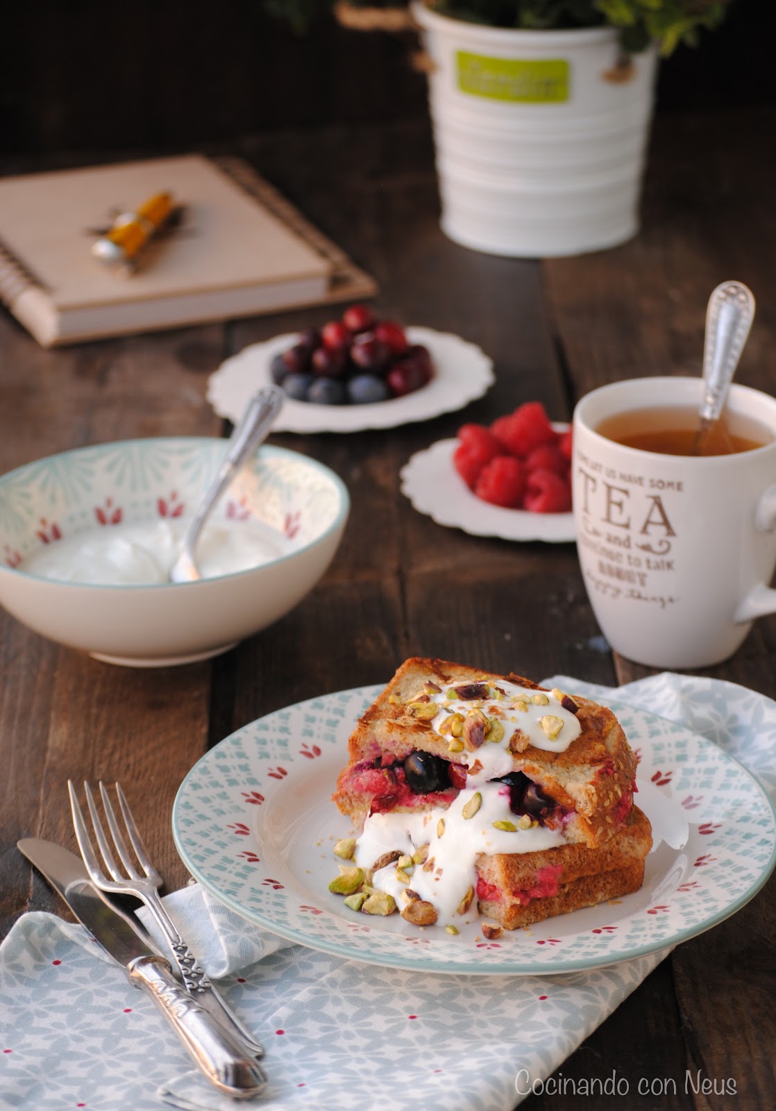 Repartimos los frutos del bosque encima de 2 rodajas de pan de molde y con las otras tapamos para formar un sándwich.