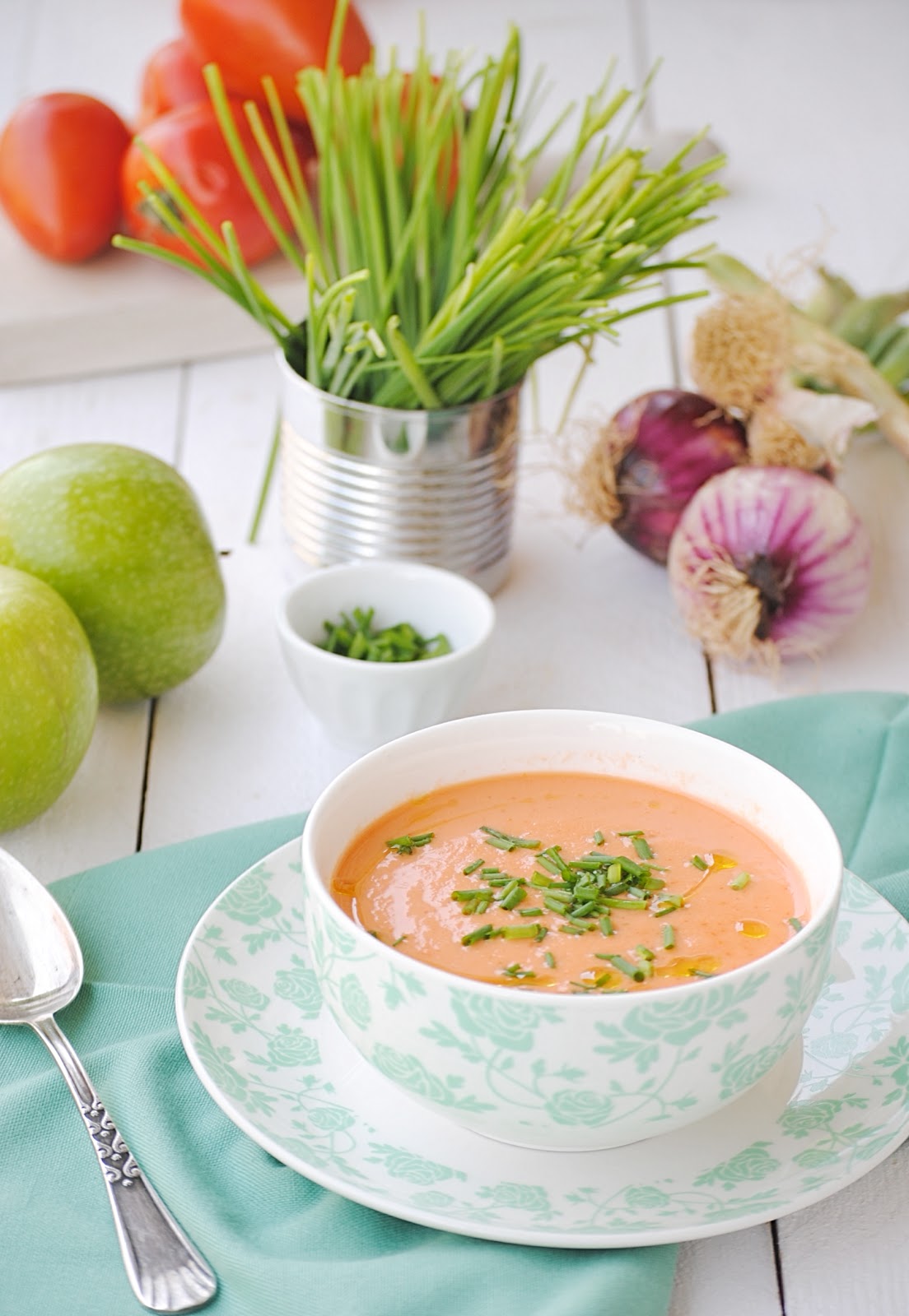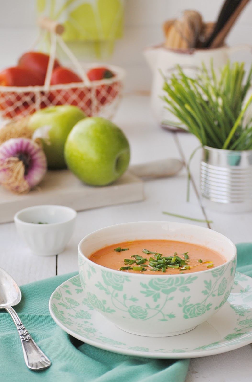 Ponemos en el vaso los tomates, las manzanas, la cebolla y el diente de ajo, trituramos 1 minuto velocidad progresiva 5-10.