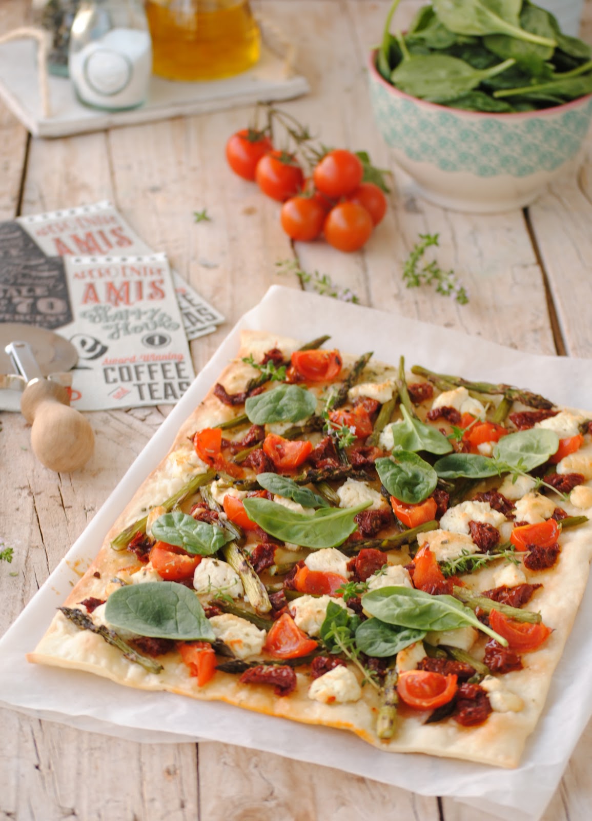 Retiramos la pizza del horno, repartimos los espárragos, los tomates secos en aceite, los tomates cherrys, desmenuzamos el queso de cabra, repartimos un chorrito de miel por la superficie, un poco de aceite de oliva virgen y espolvoreamos unas ramitas de tomillo.