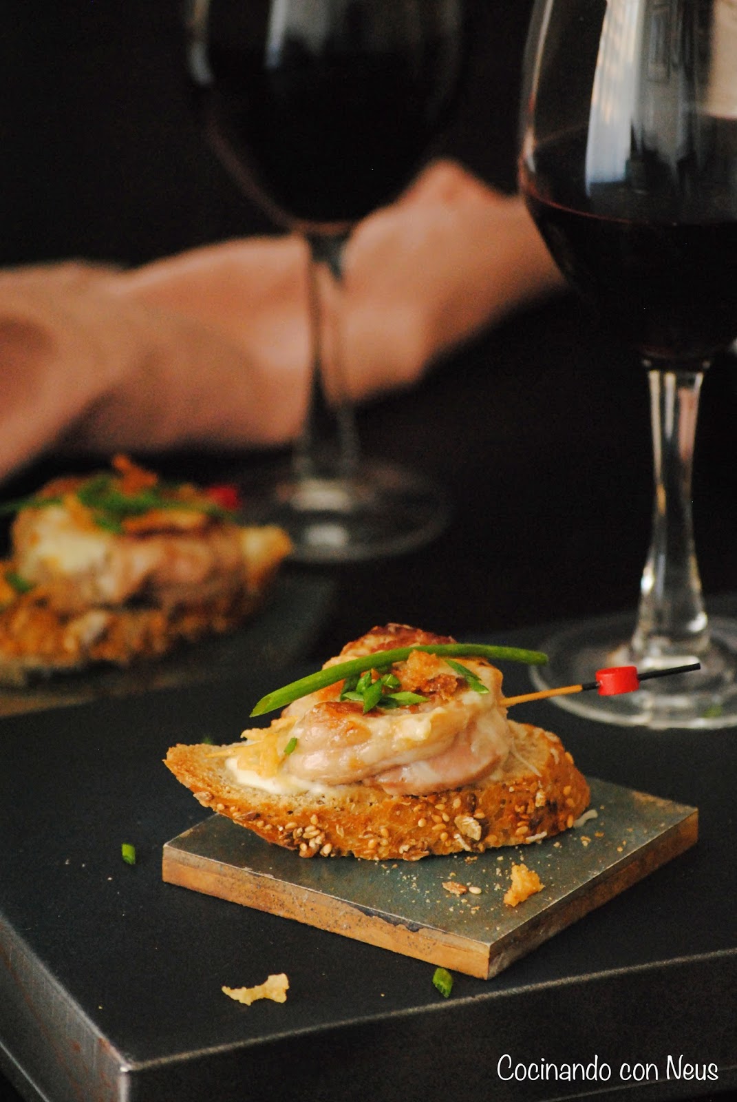 Una vez cocinados, espolvoreamos con escamas de sal maldon y los depositamos sobre el pan, ponemos una cucharada de salsa Idiazábal, rallamos un poco de queso por encima y gratinamos unos 4 o 5 minutos en el horno.