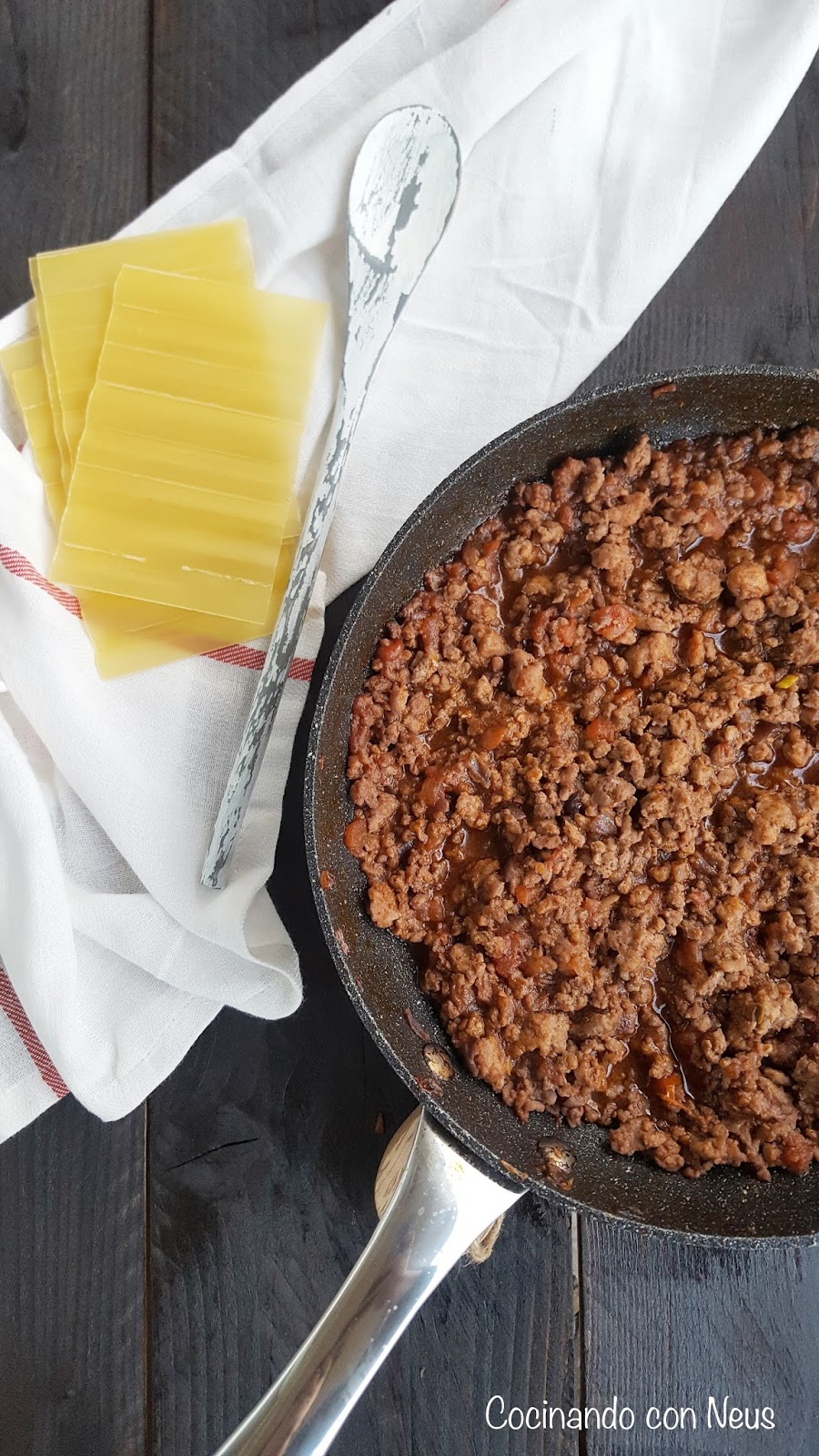 Extendemos otra capa de carne, y una capa ligera de bechamel, , añadir otra capa de láminas de lasaña.