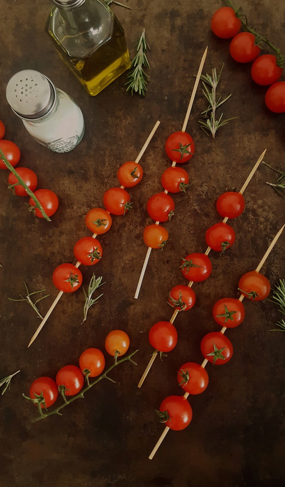 Pinchamos los tomates con los palillos, dejando espacio entre si para que la cocción sea uniforme.