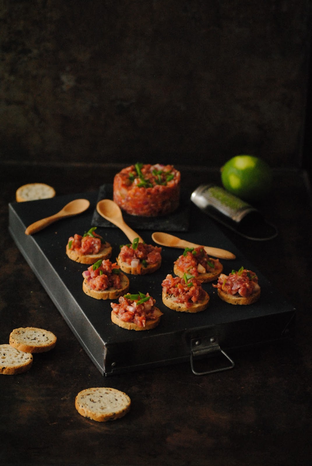 En un bol mezclamos el fuet picado, la cebolla, las alcaparras, los tomates rallados, la mostaza, la salsa Worcestershire, un poco de ralladura de lima, un chorrito de aceite de oliva virgen extra, salpimentamos al gusto.