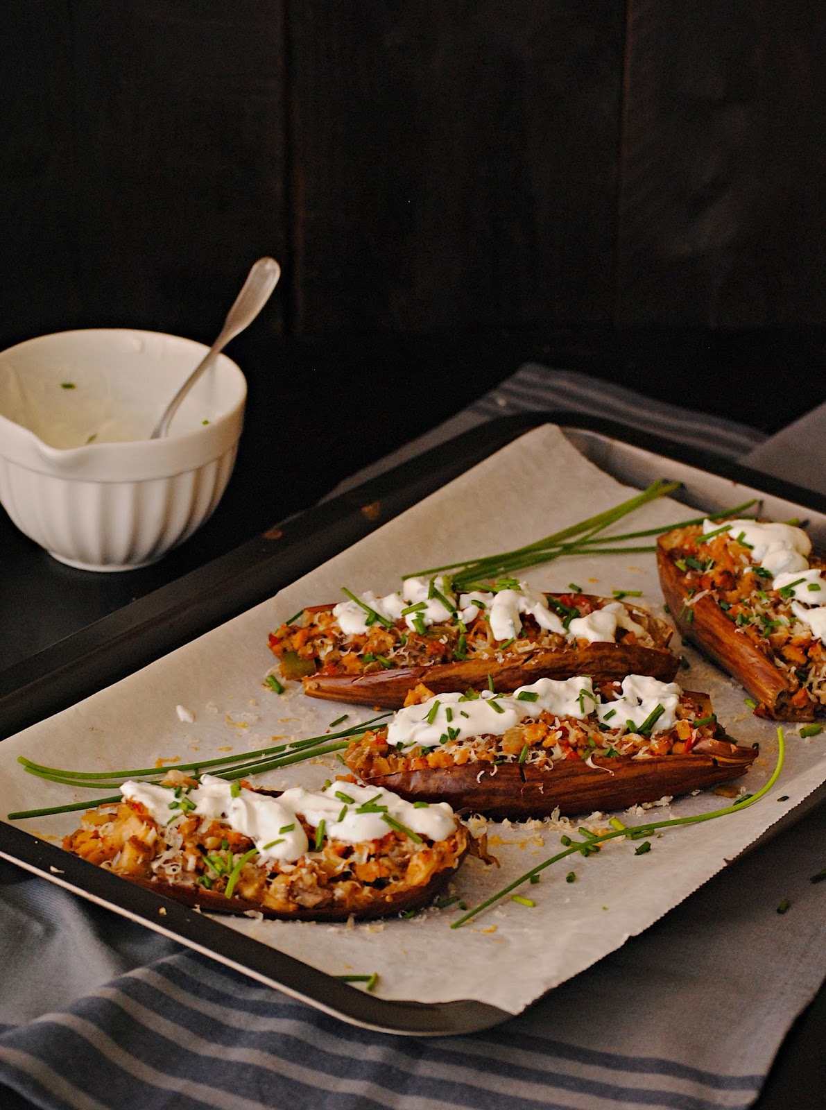 Antes de servir las berenjenas repartimos un hilo de salsa y espolvoreamos cebollino picado.
