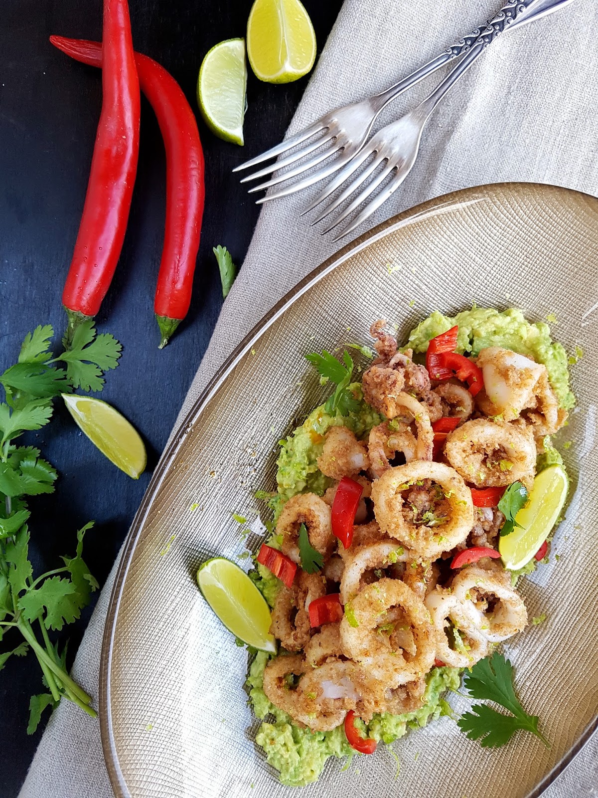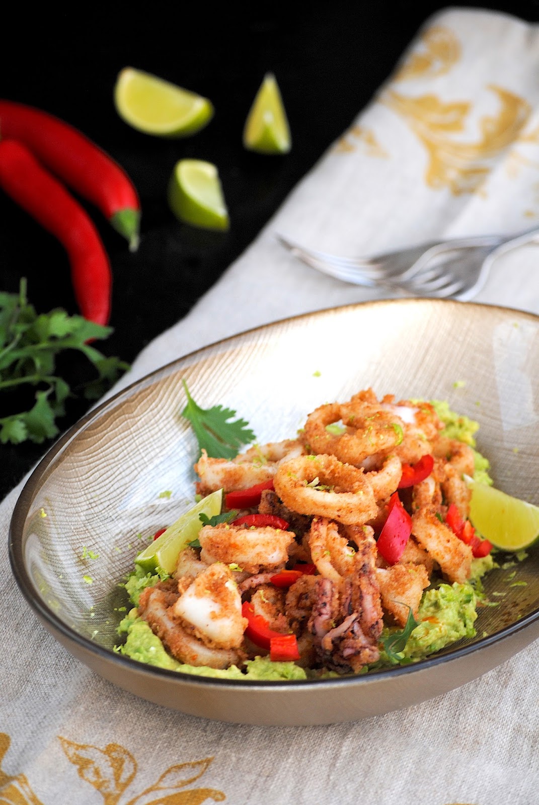 Disponemos encima del puré de aguacate los calamares, repartimos los aros de jalapeño, espolvoreamos la otra 1/2 lima y rociamos con jugo de lima.