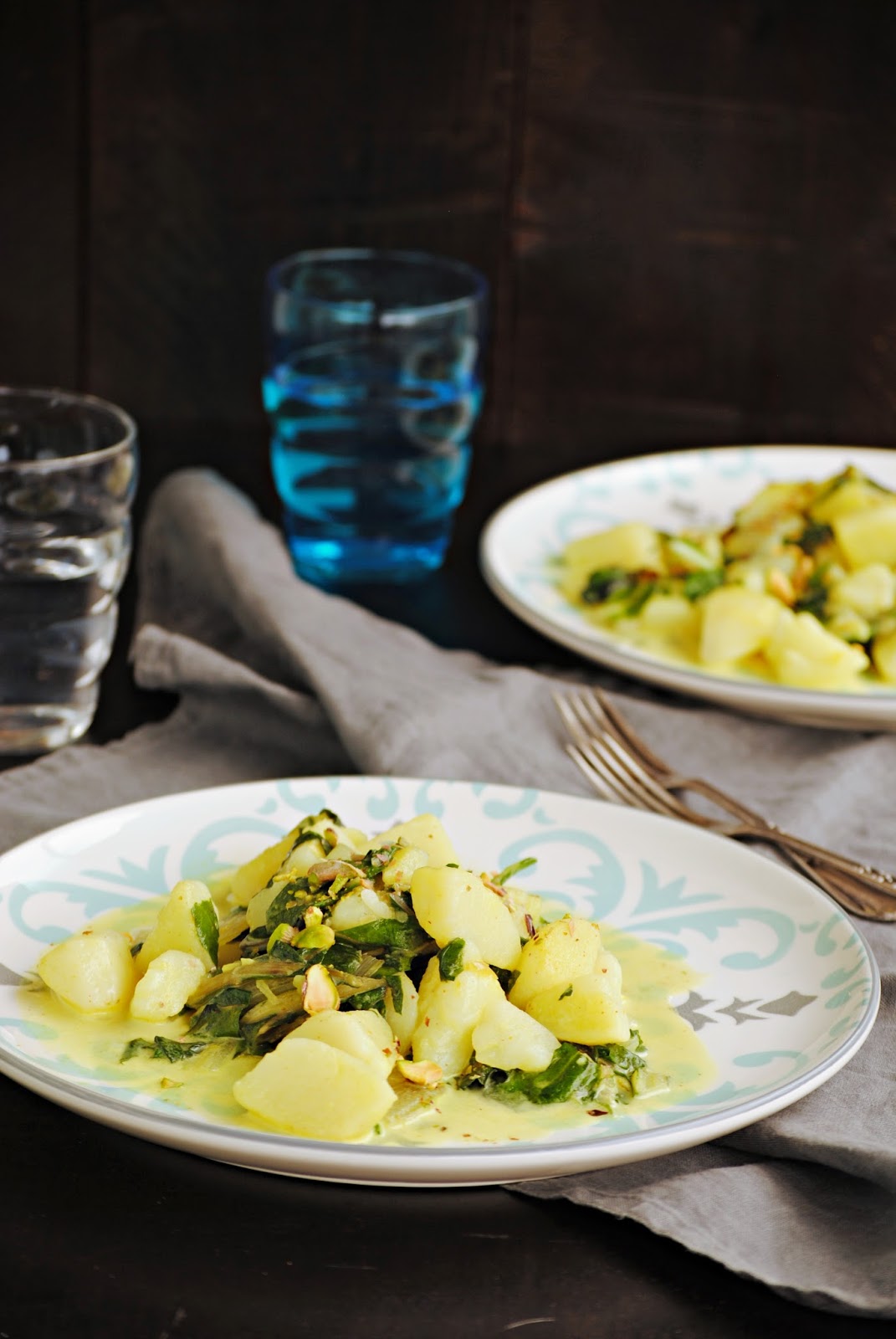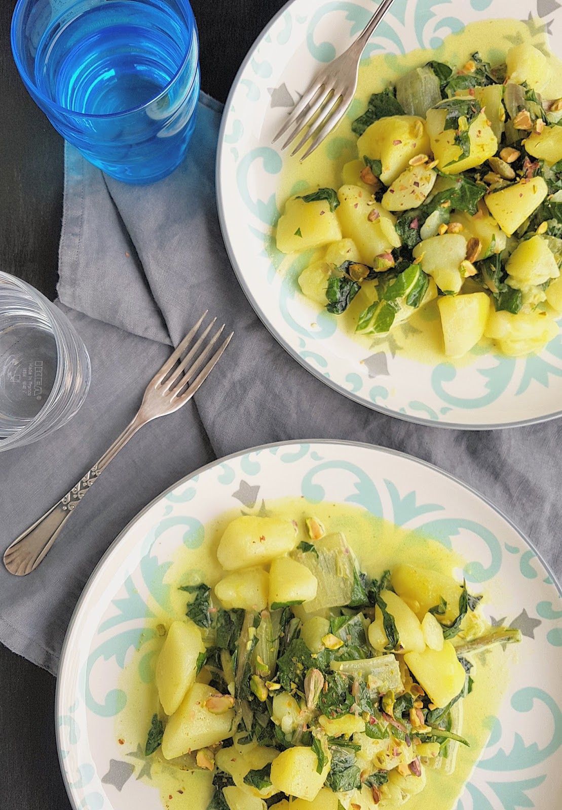 Agregamos el jengibre al gusto, el curry, removemos bien, añadimos las pencas y sofreímos un par de minutos, incorporamos las patatas y las hojas de acelgas, removemos bien para que se integren los ingredientes y se vayan haciendo las hojas por igual.