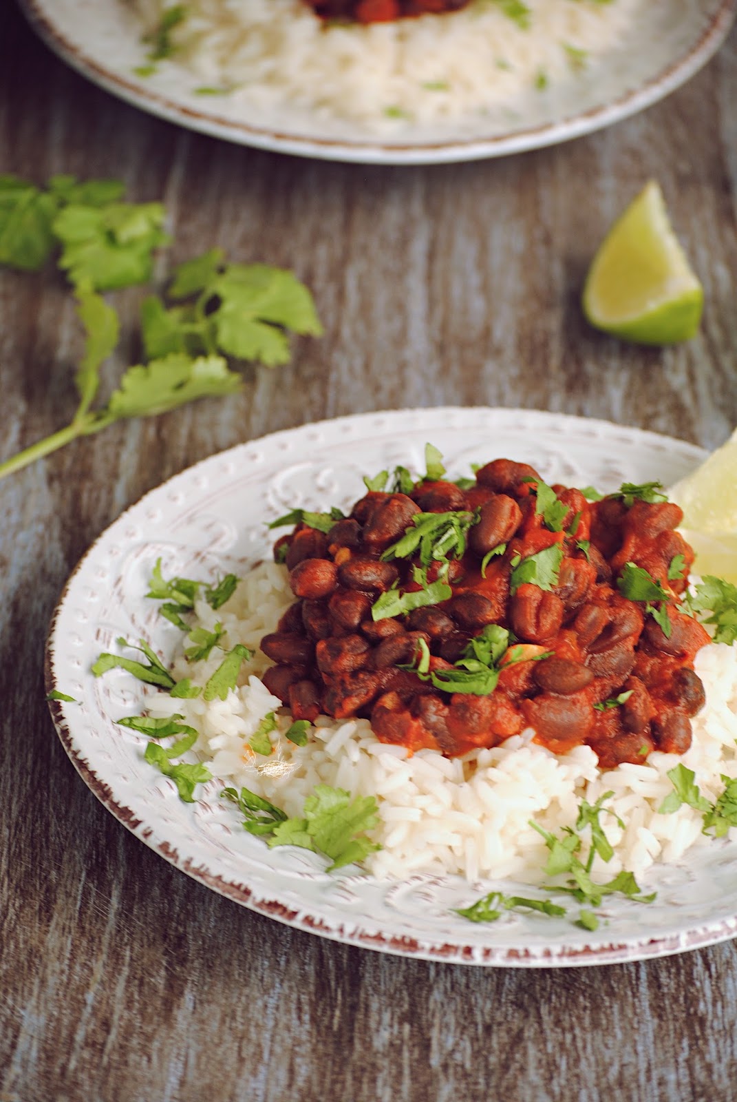 Repartimos el chili sobre una cama de arroz, espolvoreamos con cilantro al gusto y unas gotas de lima y servimos acompañado de tortillas de maíz.