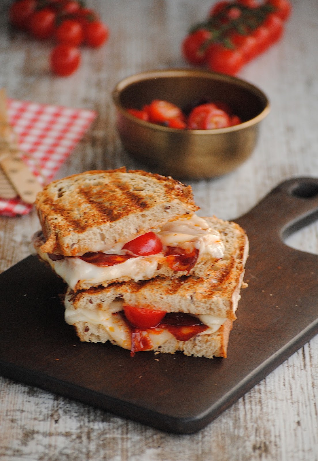 Ponemos una loncha de queso sobre el pan, repartimos el chorizo, la mezcla de tomates y chalotas y volvemos a cubrir nuevamente con queso y pan.