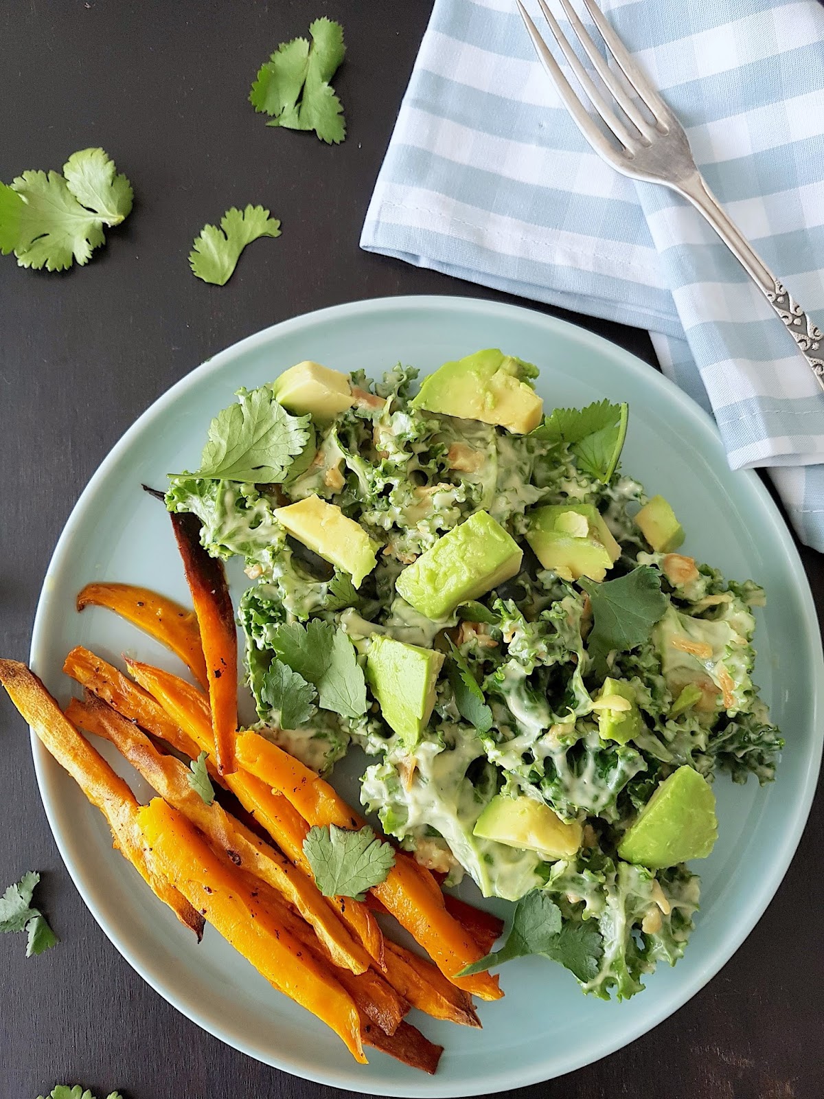 Servimos las hojas de kale en los platos donde vayamos a presentarla, repartimos el aguacate cortado a cubos, espolvoreamos unas hojas de cilantro (opcional) y  acompañamos la ensalada con los bastones de boniatos.