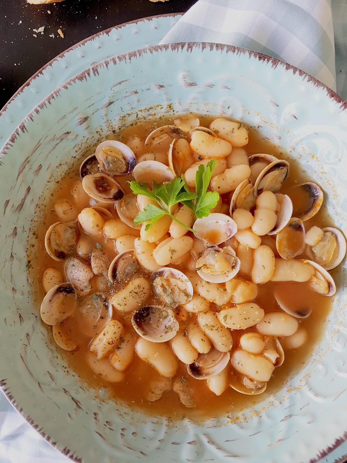 Añadimos el cava, el agua de abrir las chirlas y dejamos que hierva un par de minutos, añadimos el tomate, el pimentón a gusto las alubias bien lavadas y escurridas, si es necesario añadimos un poco de agua o caldo de verduras (que fue mi caso) y dejamos que hierva el conjunto unos 10 minutos.