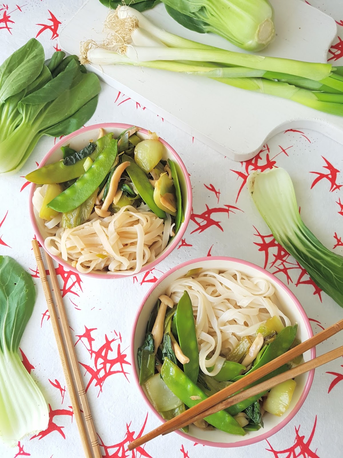 Servimos en un bol los fideos de arroz escurridos y la mezcla de verduras.