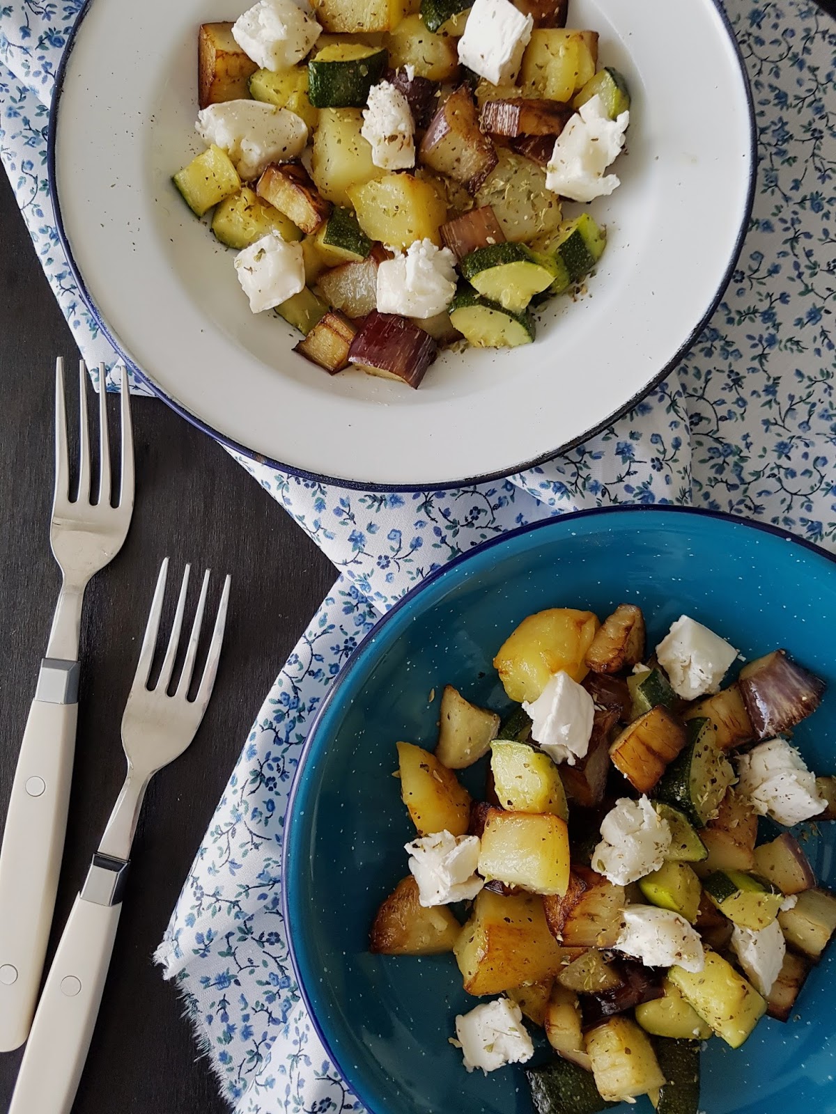 Mientras cortamos a dados pequeños el queso de cabra, mezclamos con las verduras y servimos caliente.