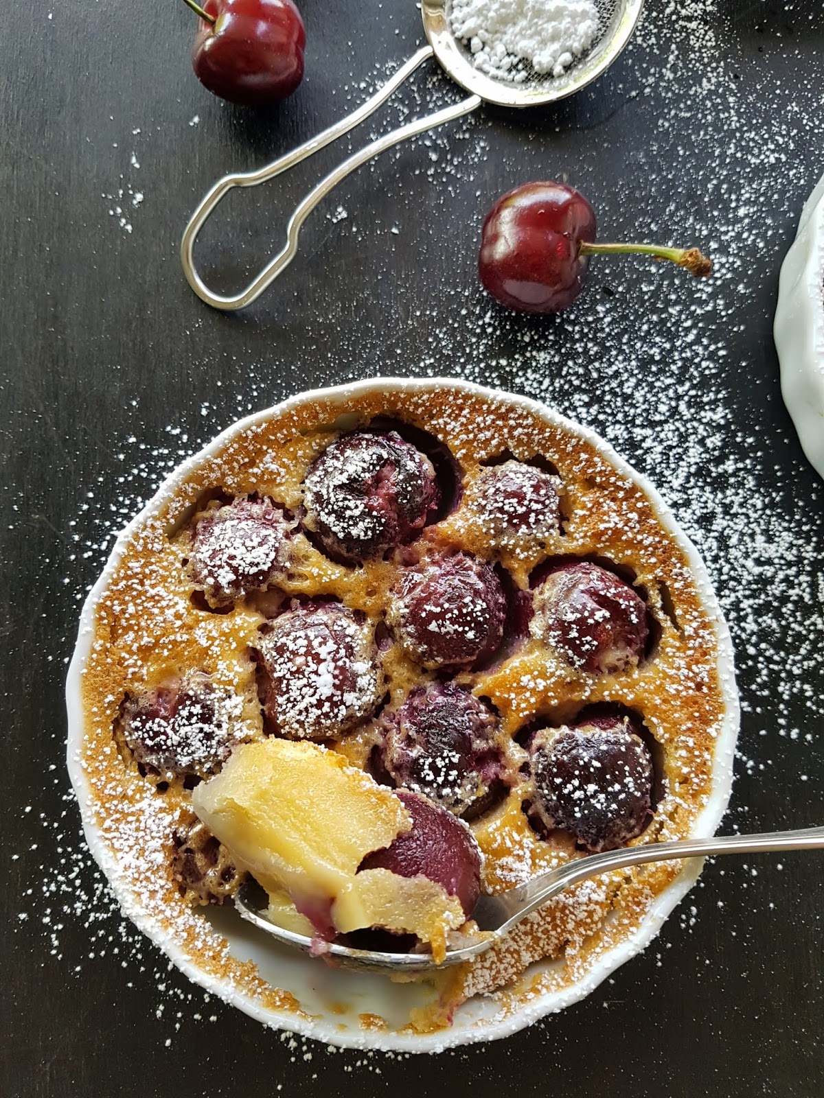 Con la llegada de las cerezas en casa siempre preparo esta típica tarta francesa, el clafoutis se elabora con leche, harina, azúcar, huevos, se hornea en un molde bajo.