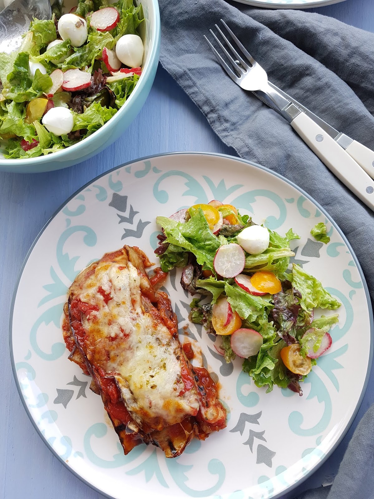 Mi plato de hoy berenjenas acompañadas de una rica ensalada.