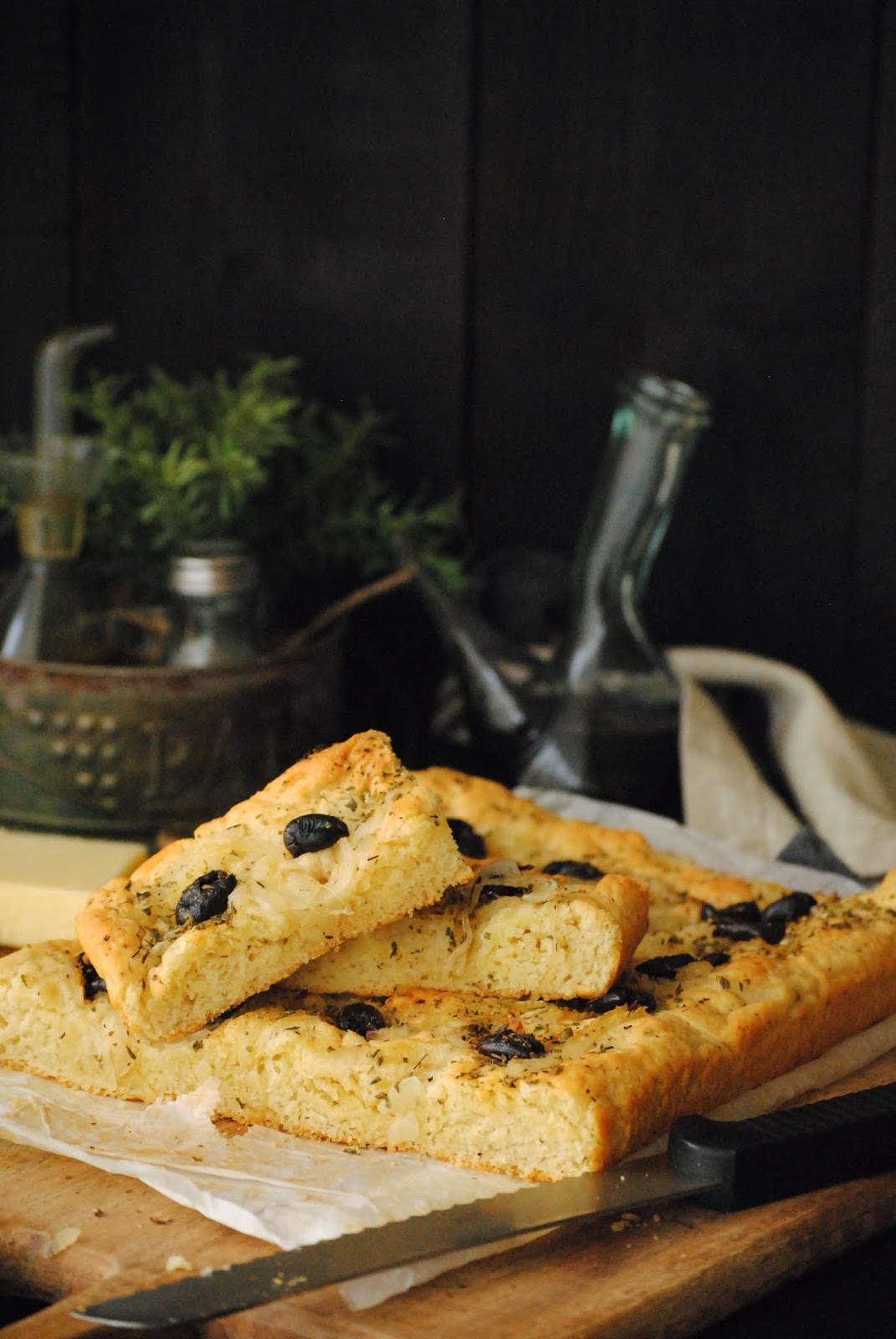 Forramos una bandeja para horno con papel de hornear, engrasamos ligeramente con aceite. Volcamos la masa en el interior y estiramos, hasta cubrir todo el molde. Hacemos marcas con los dedos en la masa, repartimos la cebolla y las olivas, tapamos con film transparente y dejamos reposar entre 1-2 horas, hasta que duplique su volumen.